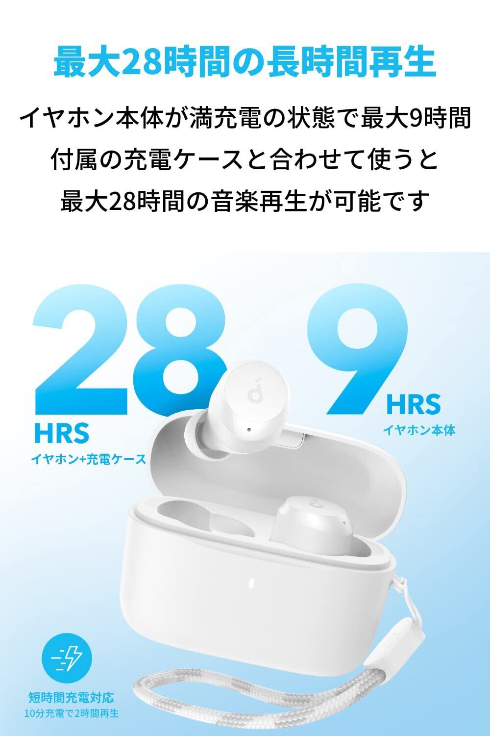 最大28時間長時間再生:イヤホン本体が満充電の状態で最大9時間、付属の充電ケースを合わせて使うと、最大28時間の音楽再生が可能です。また10分間の充電で約2時間分の音楽再生が可能です。