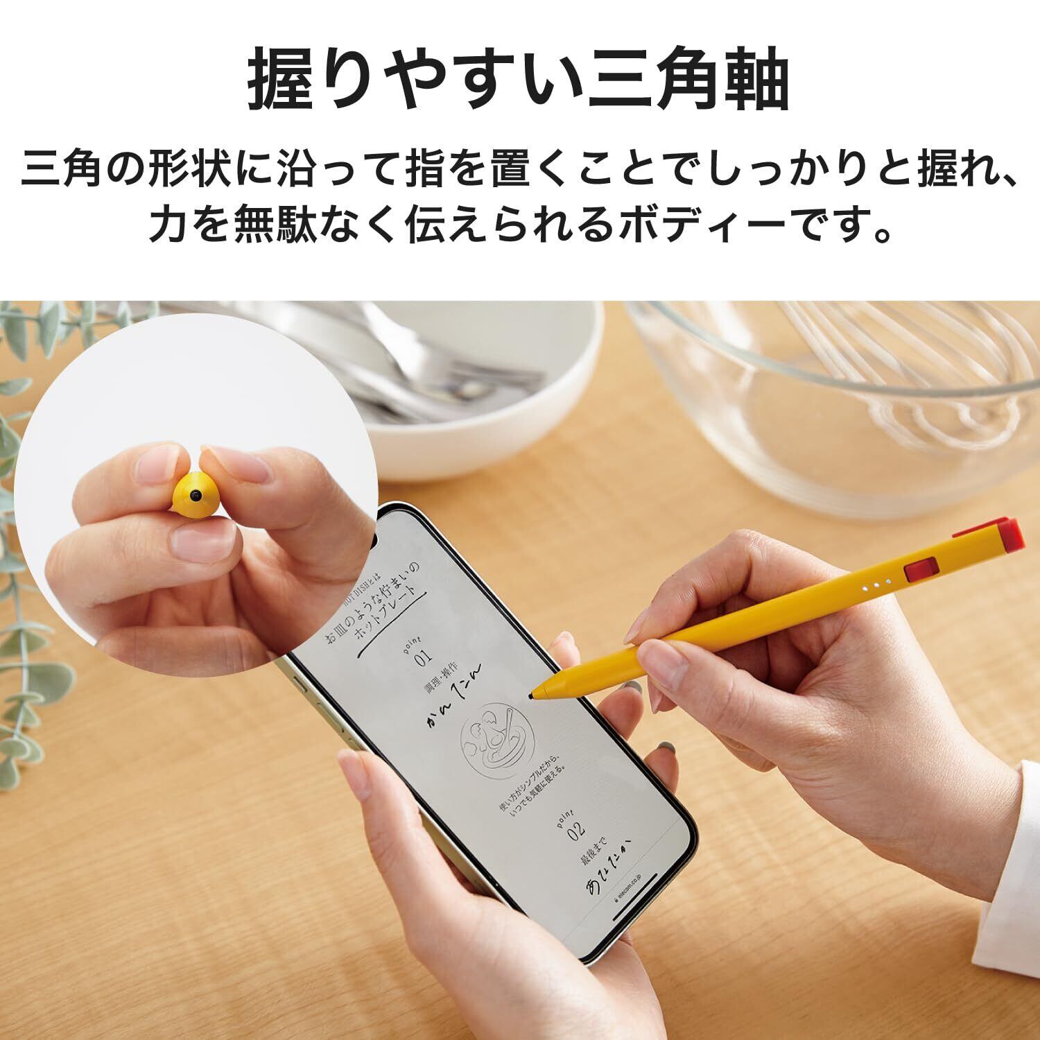 握りやすい三角軸のスマートフォン・タブレット用充電式アクティブタッチペンです。