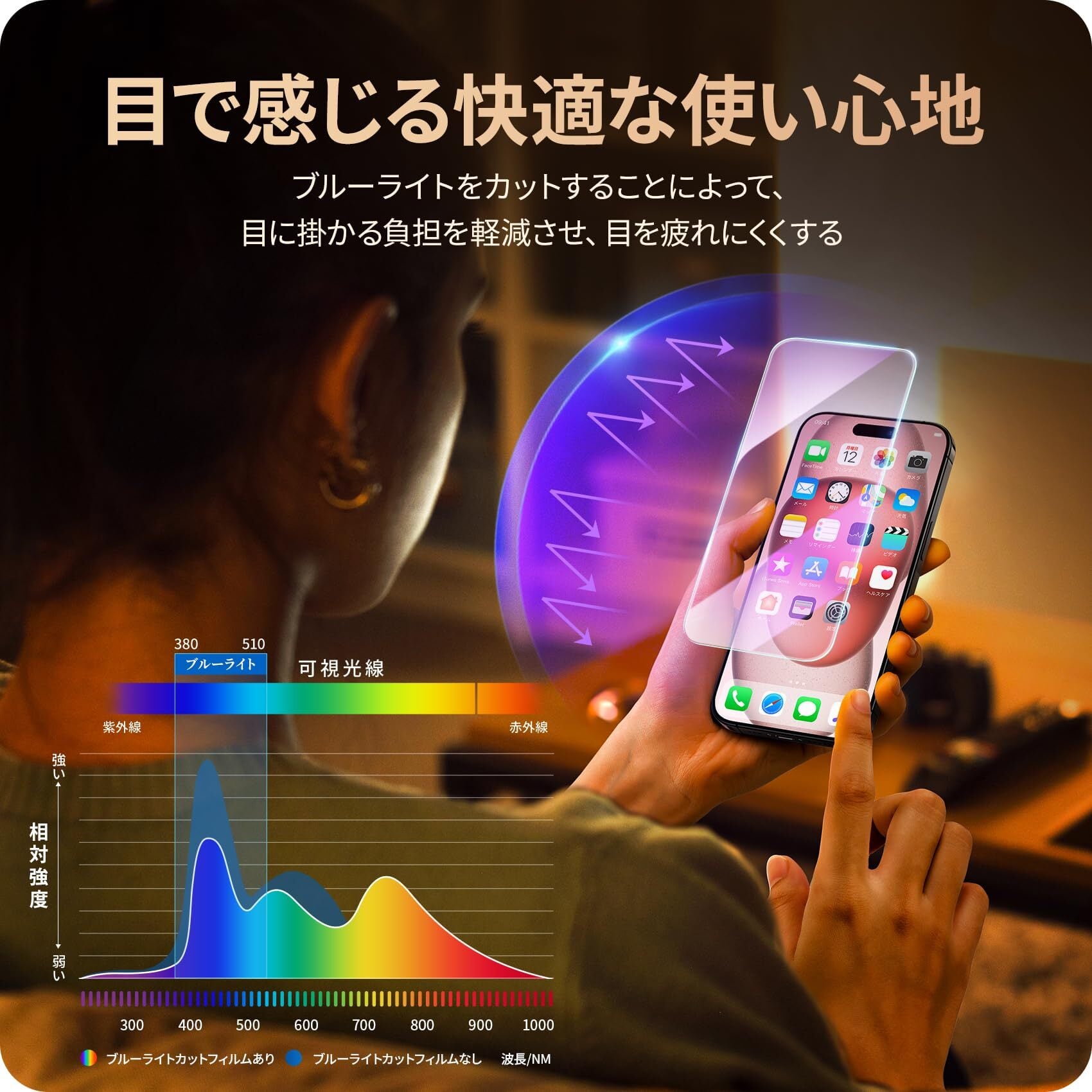 【ブルーライトカット機能・目の疲れ軽減】米軍「MIL-STD-810H」規格SGS認証(認証番号:GZMR220702278001-1)のブルーライト反射技術によりブルーライトを大幅にカットでき、長時間スマートフォンの画面を見たり、ゲームをしたりする方には、目の疲労を緩和し、視力を保護することができます。(ご注意:ブルーライトカット加工で、角度及び背景色によって、色あいなど画像と若干の違いがある場合があります。例えば、横から見る際には無色透明で、白い背景には淡い黄色く見えます。通常では薄い紫色になります。予めご了承下さい。)
