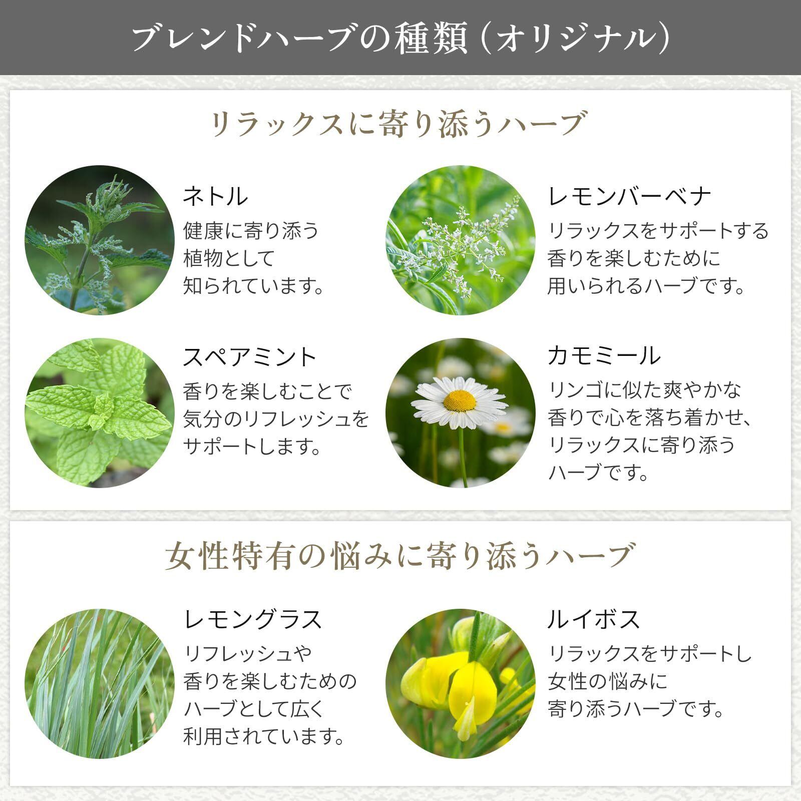 【究極のブレンド】6種のハーブ、レモングラス、スペアミント、ネトル、ルイボス、カモミール、レモンバーベナ。すべてのハーブは農薬や化学肥料を使わずに、堆肥やぼかしを駆使して、丁寧に育て上げられています。