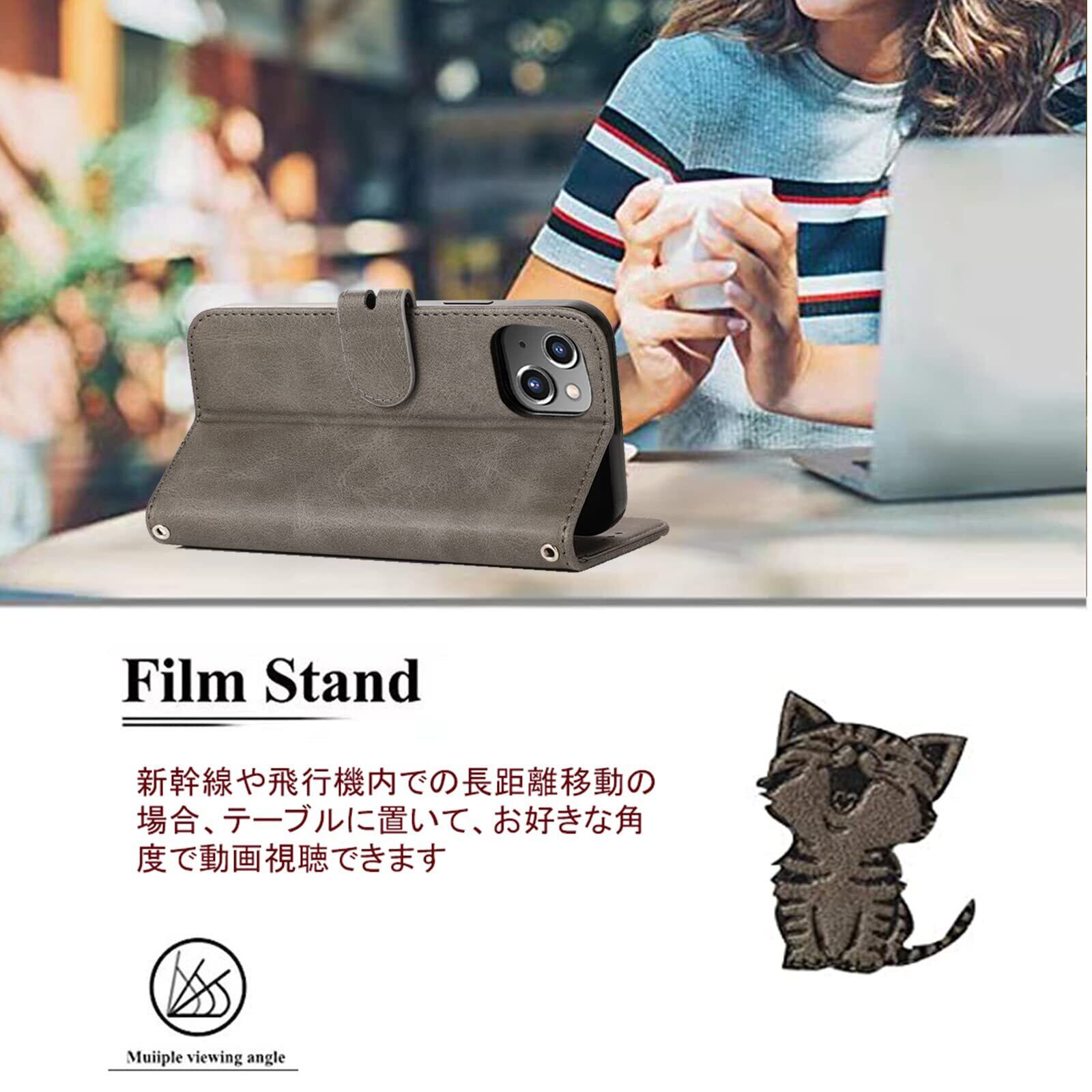 ❹【スマイル猫ちゃんのデザインと上質な素材】型押しの可愛い猫のモチーフと上品なレザーの組み合わせるケースであり、高級感ある色合いでちょっぴり大人なスマホケース。裏側ケースはソフトのtpuで仕上げられて、着脱も便利です。ストラップも付いて、日常性型にもっと便利になります。