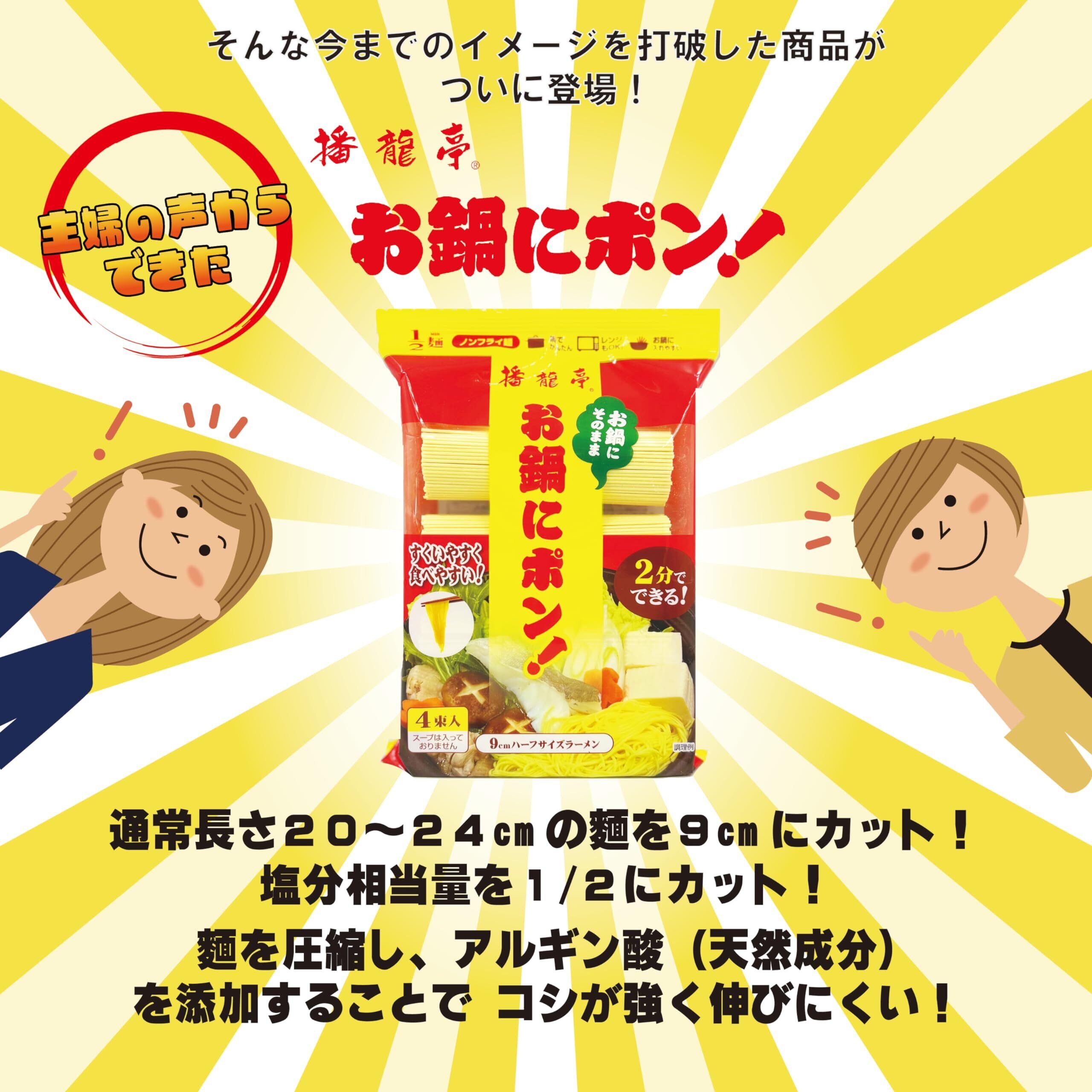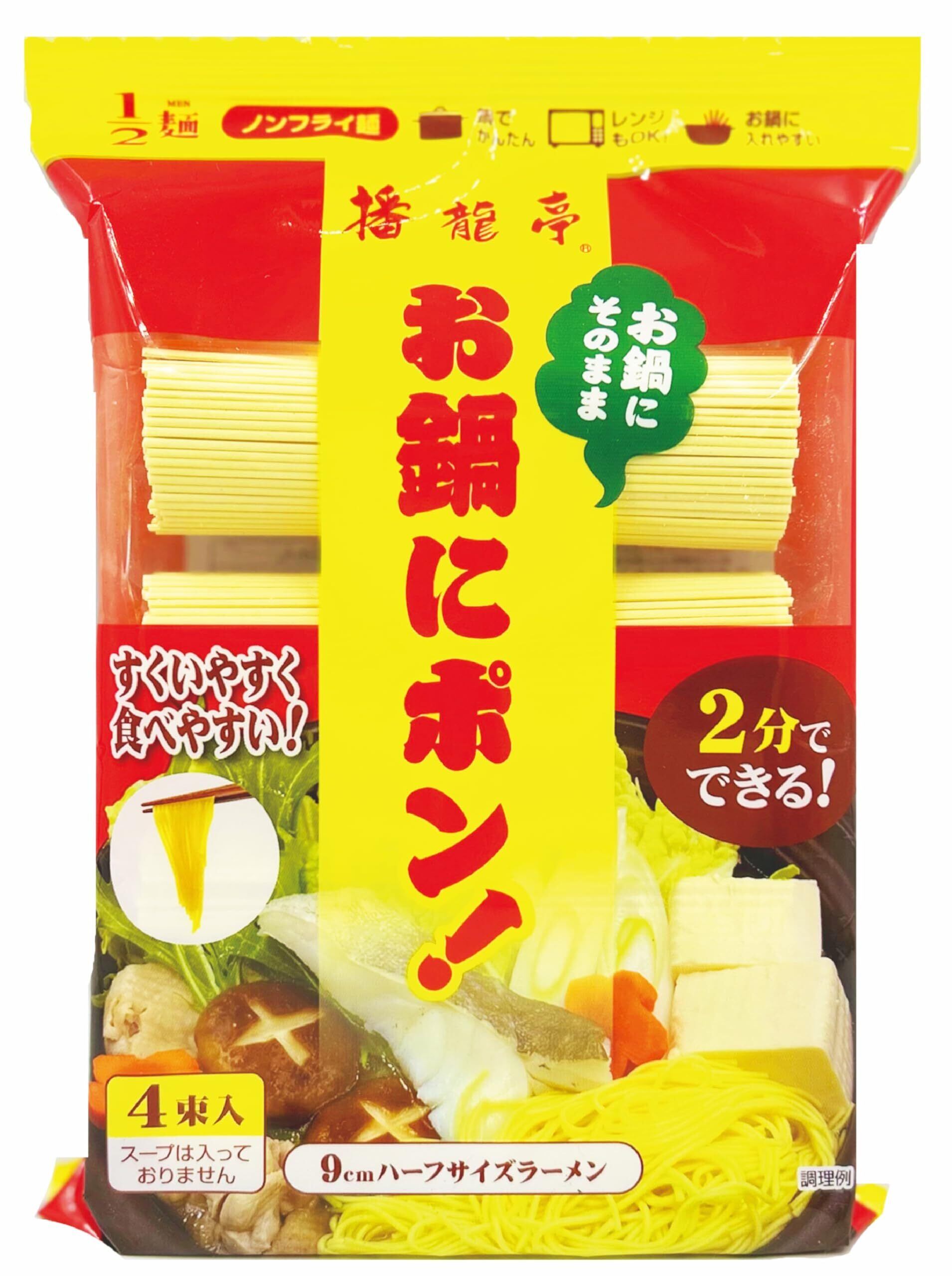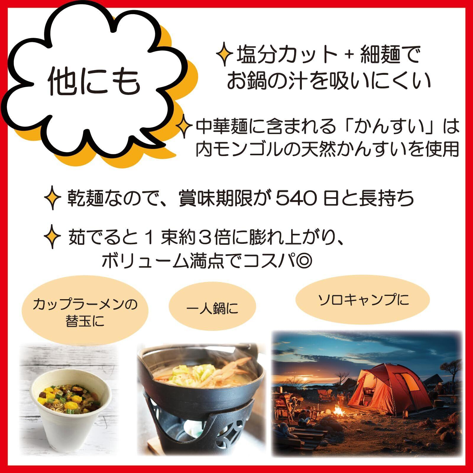 【なにが1/2なの?】麺の長さ(9㎝)と、食塩を1/2(日本食品標準成分表(7訂))にしました。【1/2にするとどうなるの?】取りやすく、汁はねしにくい!お鍋の途中にそのまま入れられる鍋用ラーメンです。「一人用鍋」や「ソロキャンプ用」にも最適です。鍋スープの味も変わりにくいです。【ほかの特徴は?】お鍋にそのまま入れても伸びにくい麺です。お腹がすいて早く麺を食べたい!そんな時にも最初にお鍋にポン!と入れれば2分でもう食べられます。コシも強く、食べ応えがあり、香りも良いので最後まで楽しめます。
