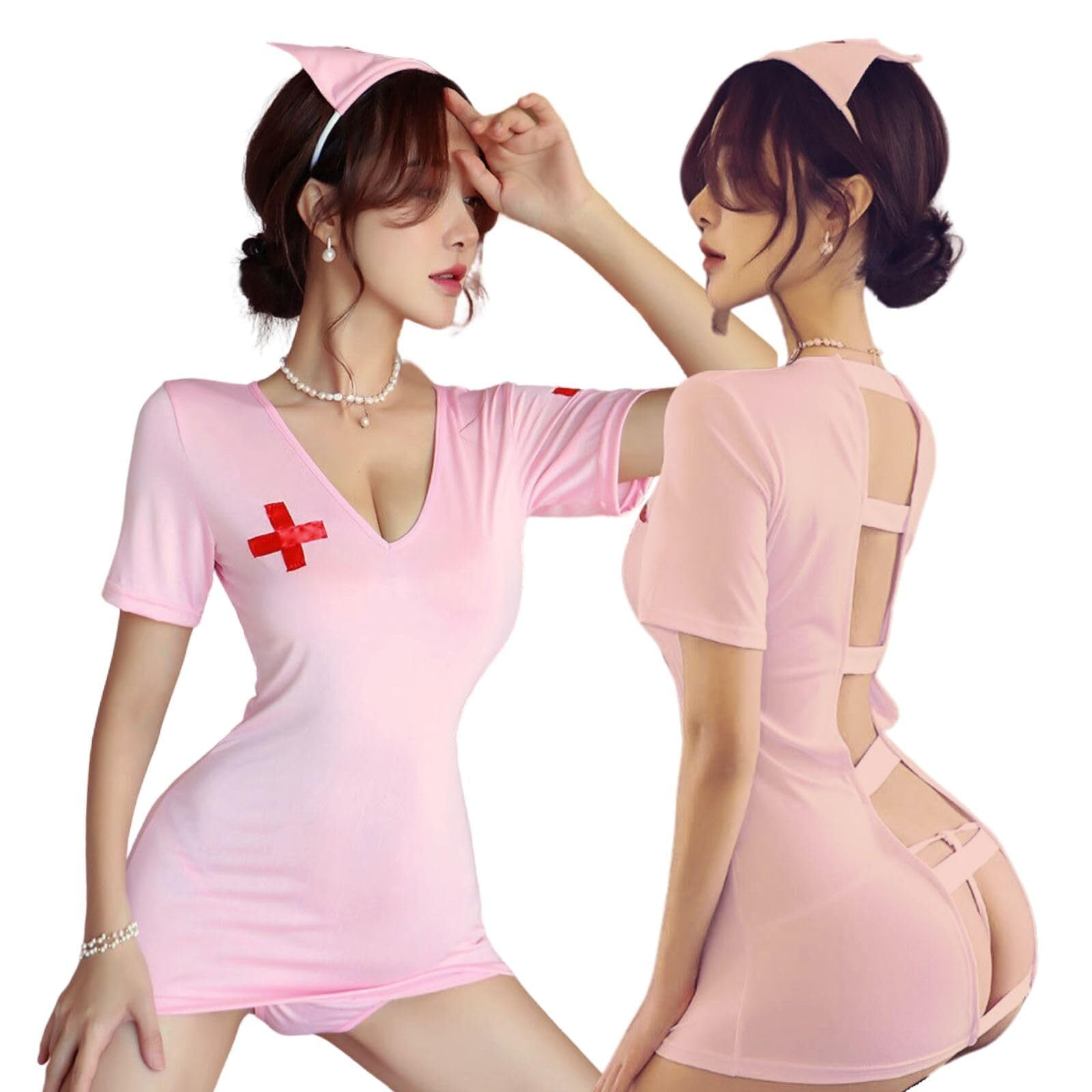 【特徴】大胆に空いた背中とミニマムなスカート丈が魅力的な、セクシー悩殺ナース服です!肌触りと伸縮性に優れたストレッチニット素材同色のカチューシャとTショーツも付属します。