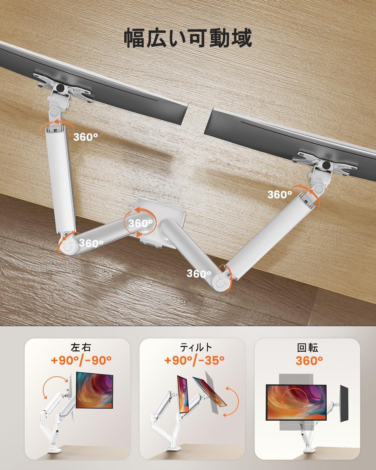 【片手で移動できる!ガス式アーム】一般的なモニターアームは移動する時に毎回ネジの調整が必要でしたが、ErGearデュアルモニターアームはガスシリンダーを搭載することにより、モニターを軽い力で楽々動かせます。また、より長く設計されたアームと3つの可動関節で、幅広い範囲に移動できます。作業姿勢・環境に合わせて、画面を左右に配置したり、上下に配置したり、自由な配置ができます。