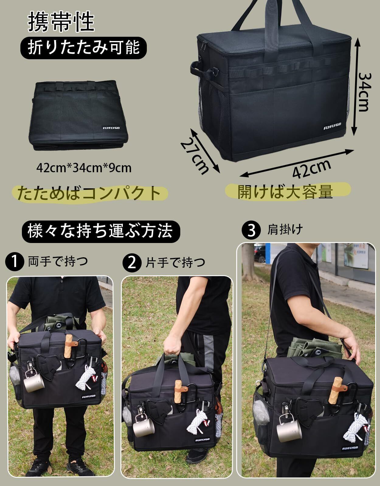 【製品のサイズ】FLYFLYGOキャンプ 収納ボックス、ソフト収納ボックスです。展開時サイズ:幅42cm X 奥行き27cm X 高さ34cm。折り畳み時サイズ:縦42cm X 横34cm X 厚み9cm。