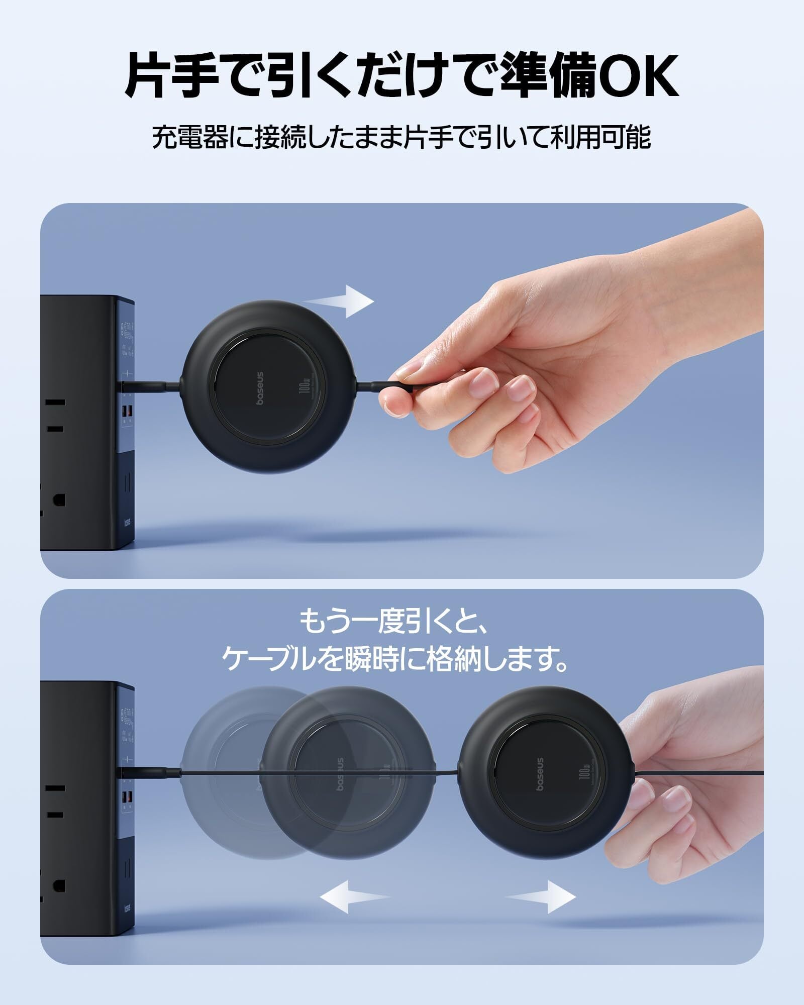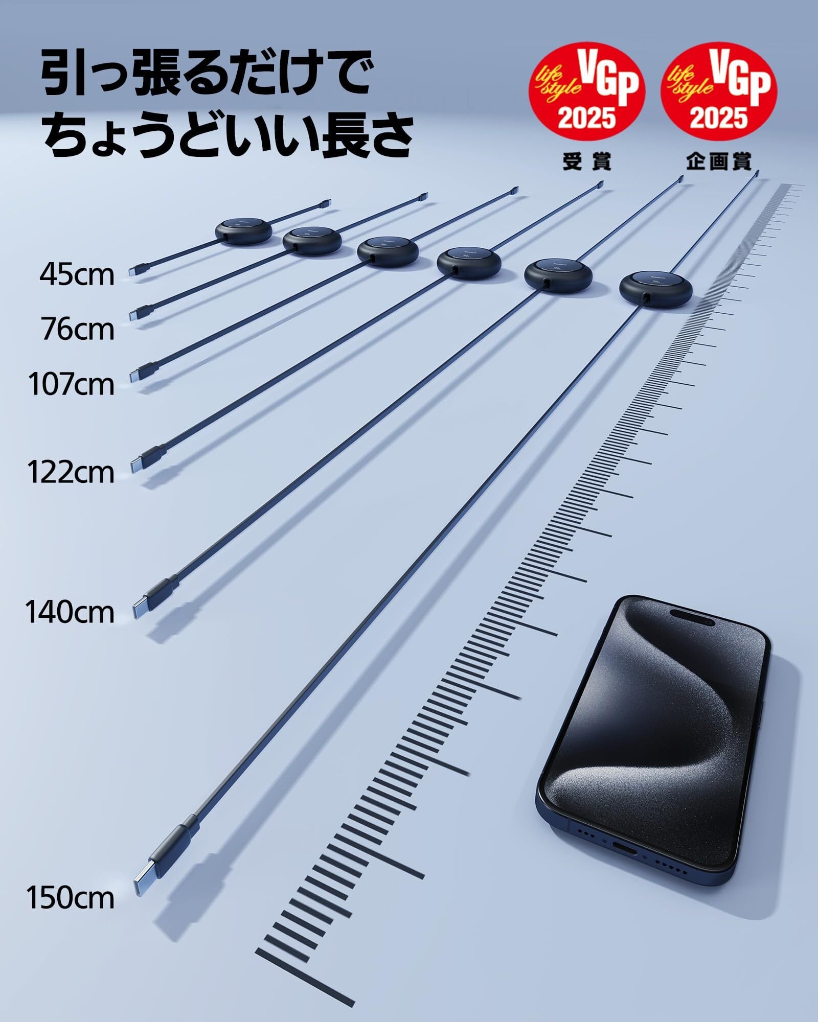 【完全巻き取り式・耐久性抜群】 巻き取り式のUSB-C充電ケーブルは、引っ張るだけで簡単に収納でき、スペースを節約。絡まりやすいケーブルや散らかりやすい充電環境とは無縁です。50,000回以上の引っ張りテストに耐える耐久性を実現。いつでも安定したパフォーマンスを提供し、ケーブル交換は長期間不要です。