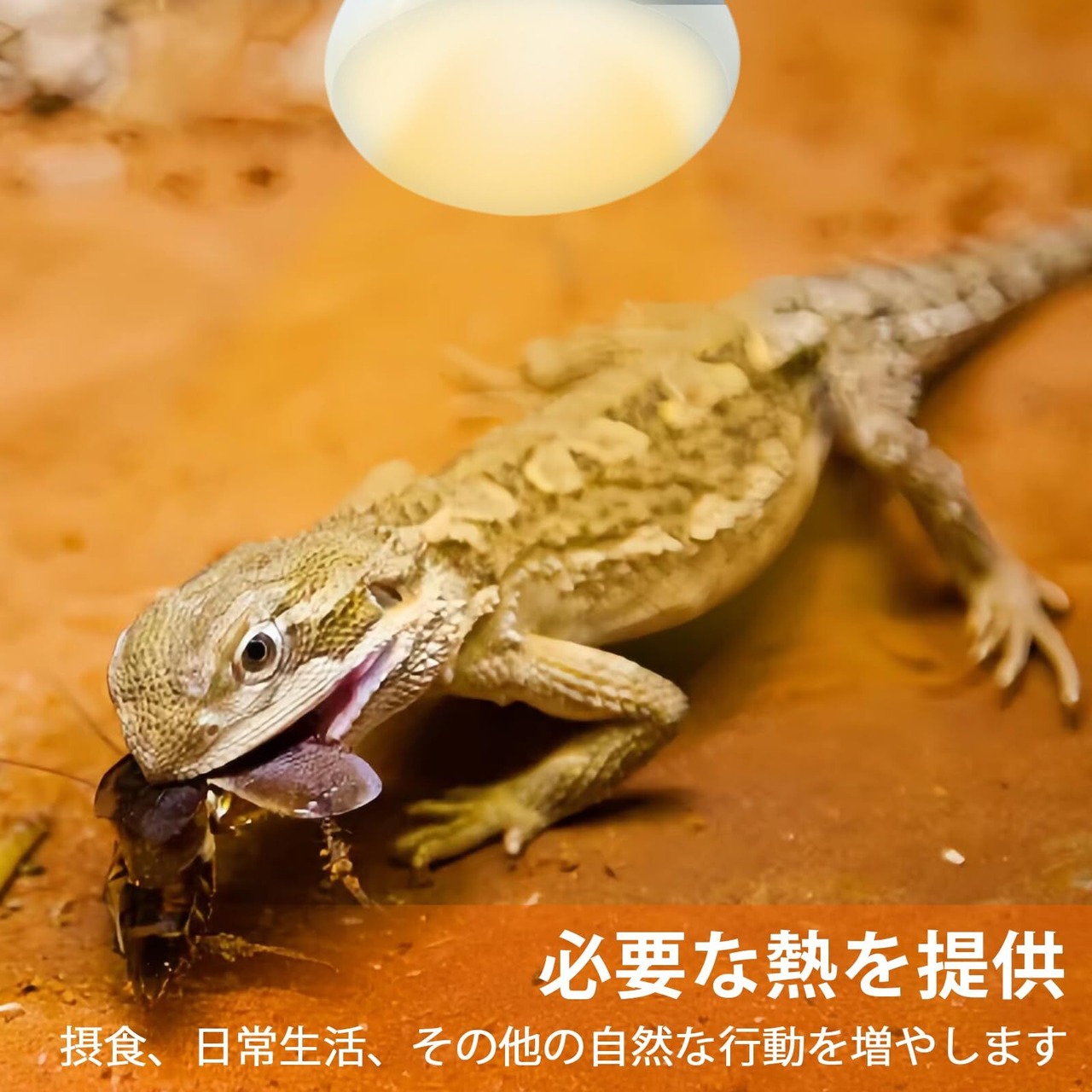 使用方法 - 爬虫類 保温ライトはE26ベースで簡単に取り付けられます。保温球の通常の運用状態を維持するために、1日8~12時間点灯させてください。おすすめでは3ヶ月ごとに交換し、UVA照射の効果が最も高いです。過度の温度上昇を防ぐため、保温電球は爬虫類から25cm以上離してください。他の爬虫類用照明器具との併用には十分ご注意ください。