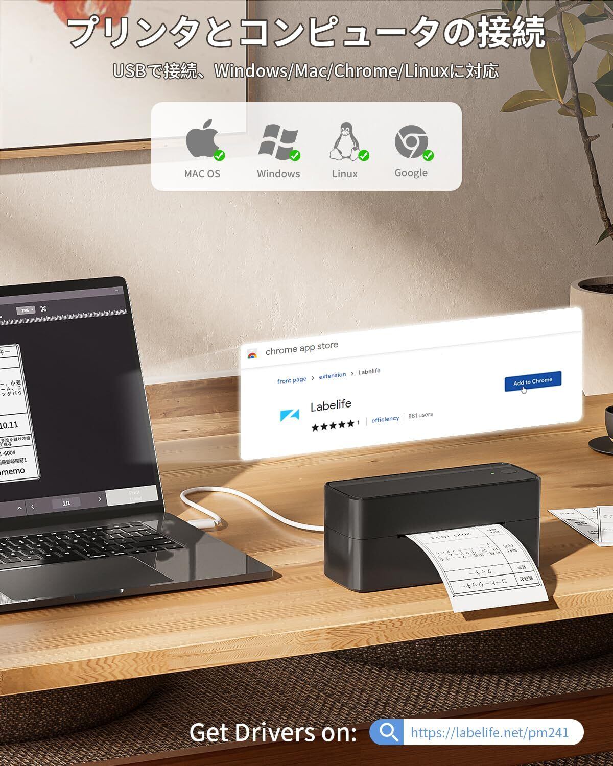 使いやすい -- PC、Windows、Mac OS、Chrome OS、Linuxシステムと互換性のある郵便ラベルプリンターです。Chrome OSの場合、Chromeウェブストアで "Labelife "を入力し、Google Chromeに拡張機能を追加する必要があります。(PC印刷はドライバをダウンロードする必要があります: labelife.net/pm241) 注意: PCはUSB接続でのみ動作し、Bluetoothで印刷することはできません。