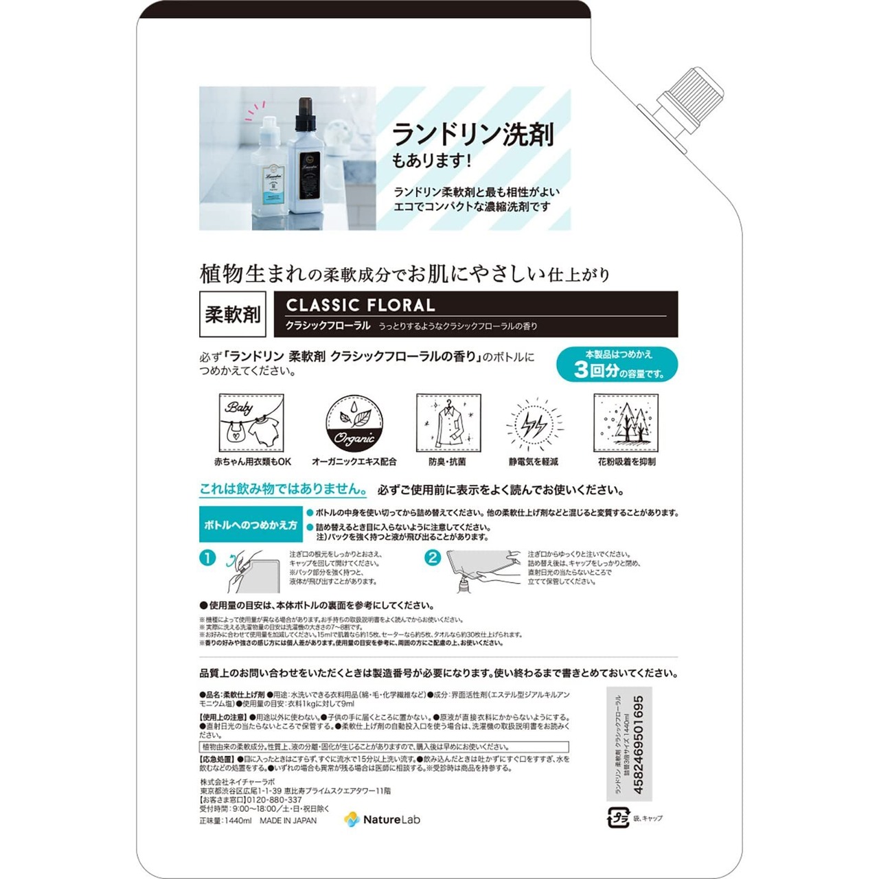 ランドリン 柔軟剤 詰替え「3倍サイズ」 クラシックフローラル 1440ml×8セット ケースでお届けします。 キャップタイプだから詰め替えも保管もラクラク。 植物生まれの柔軟剤成分でお肌にやさしい仕上がり。 赤ちゃん衣類にもお使いいただけます。 花粉吸着の抑制、抗菌・防臭にも◎ 上品なクラシックフローラルの香りをお楽しみください。