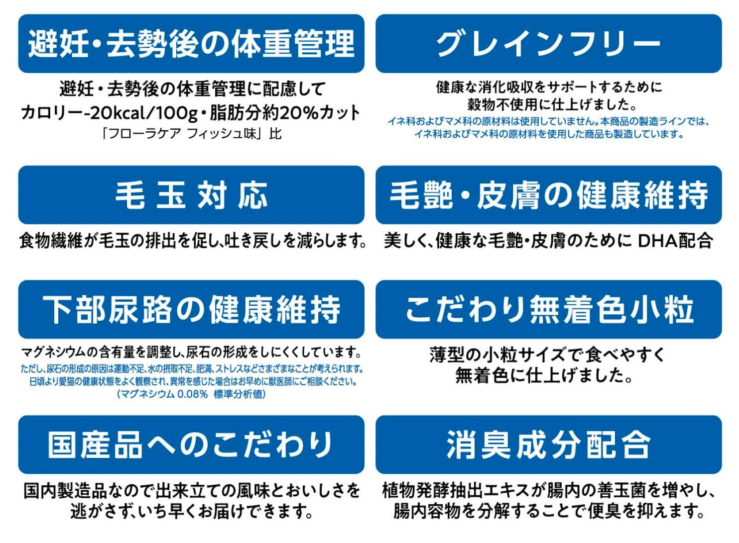オリゴ糖・食物繊維が善玉菌をそだて、納豆菌・酪酸菌が善玉菌をふやすことで腸内の健康を維持します。 健康な消化吸収をサポートするためにグレインフリー(穀物不使用)に仕上げました。避妊・去勢後の太りやすい体質をサポートするためにカロリー-20Kcal/100g・脂肪分約20%カット(フローラケアフィッシュ味比)。下部尿路の健康維持に低マグネシウム設計(標準分析値0.08%)、毛玉に配慮して食物繊維、美しく健康な毛艶・皮膚のためにフィッシュオイル(DHA)、ニオイに配慮して植物発酵抽出エキスを配合しました。 ※イネ科およびマメ科の原材料は使用していません。