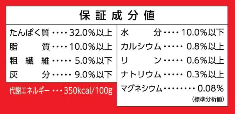 たんぱく質:32.0%以上 、脂質:10.0%以上、粗繊維:5.0%以下、灰分9.0%以下、水分:10.0%以下、カルシウム:0.8%以上、リン:0.6%以上、ナトリウム:0.3%以上、マグネシウム:0.08%(標準分析値)