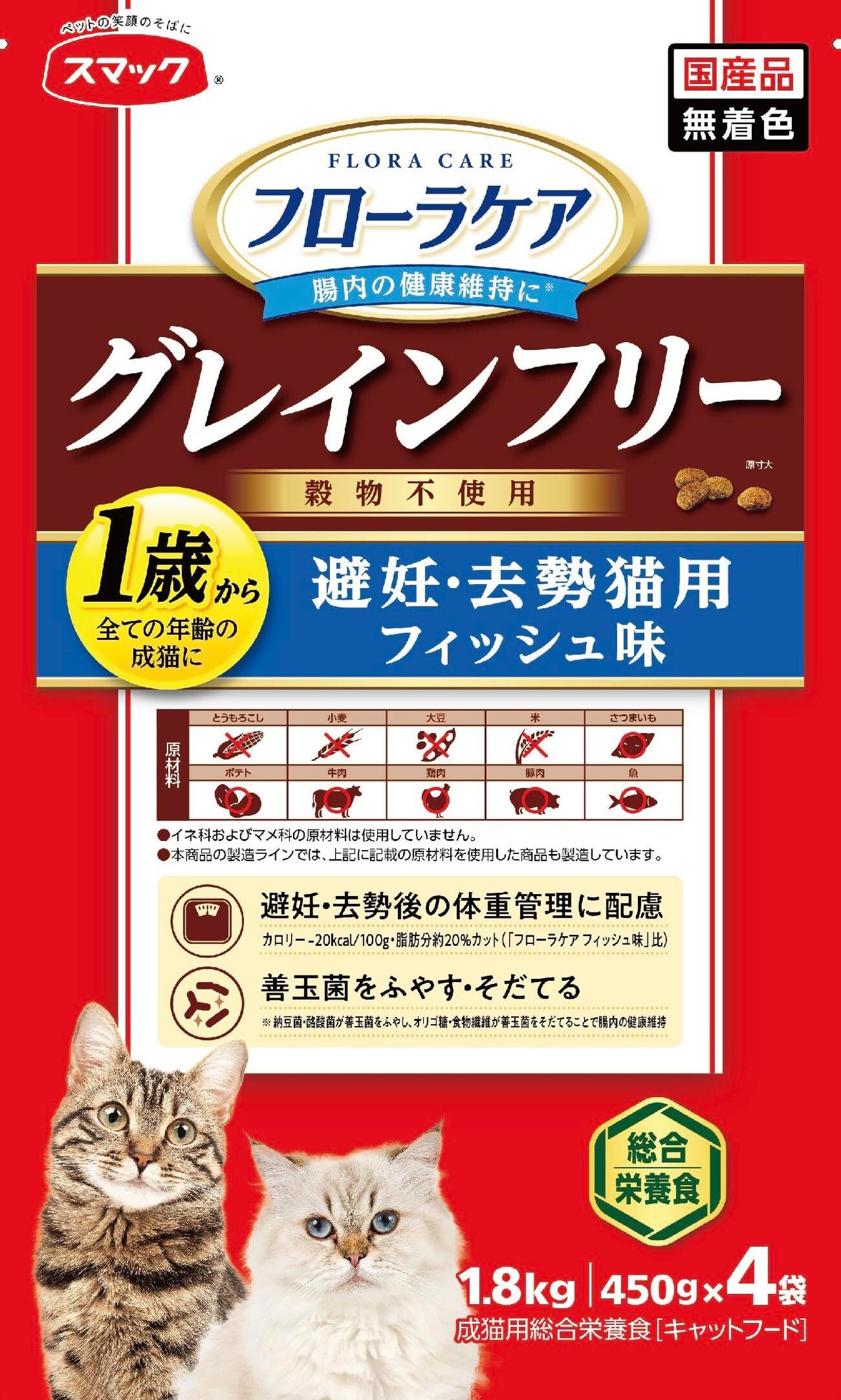スマック グレインフリー キャットフード フローラケア 避妊・去勢猫用 フィッシュ味 1.8kg (450g×4) 国産 総合栄養食 穀物不使用 1歳から