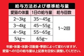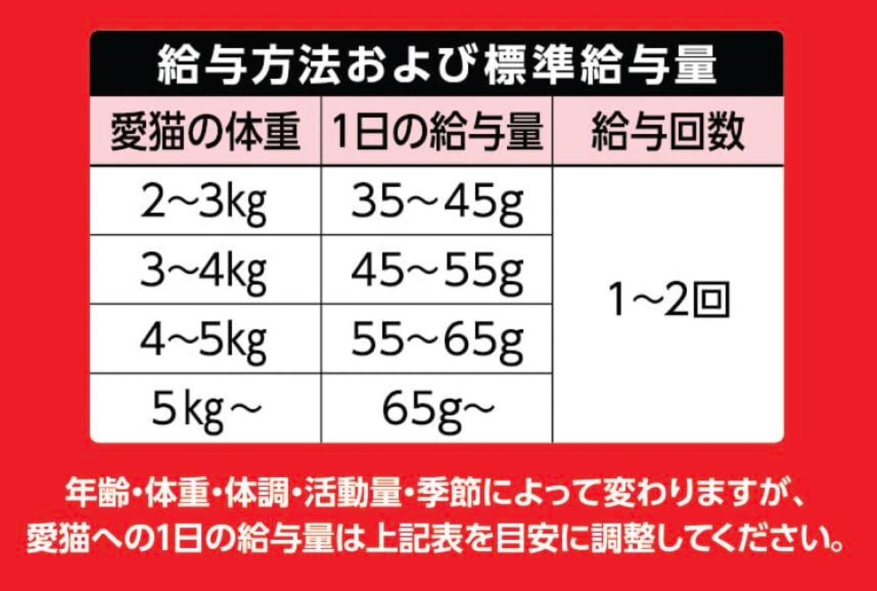 年齢・体重・体調・活動量・季節によって変わりますが、愛猫への1日の給与量は[1日の給与量の目安]を目安に調整してください。