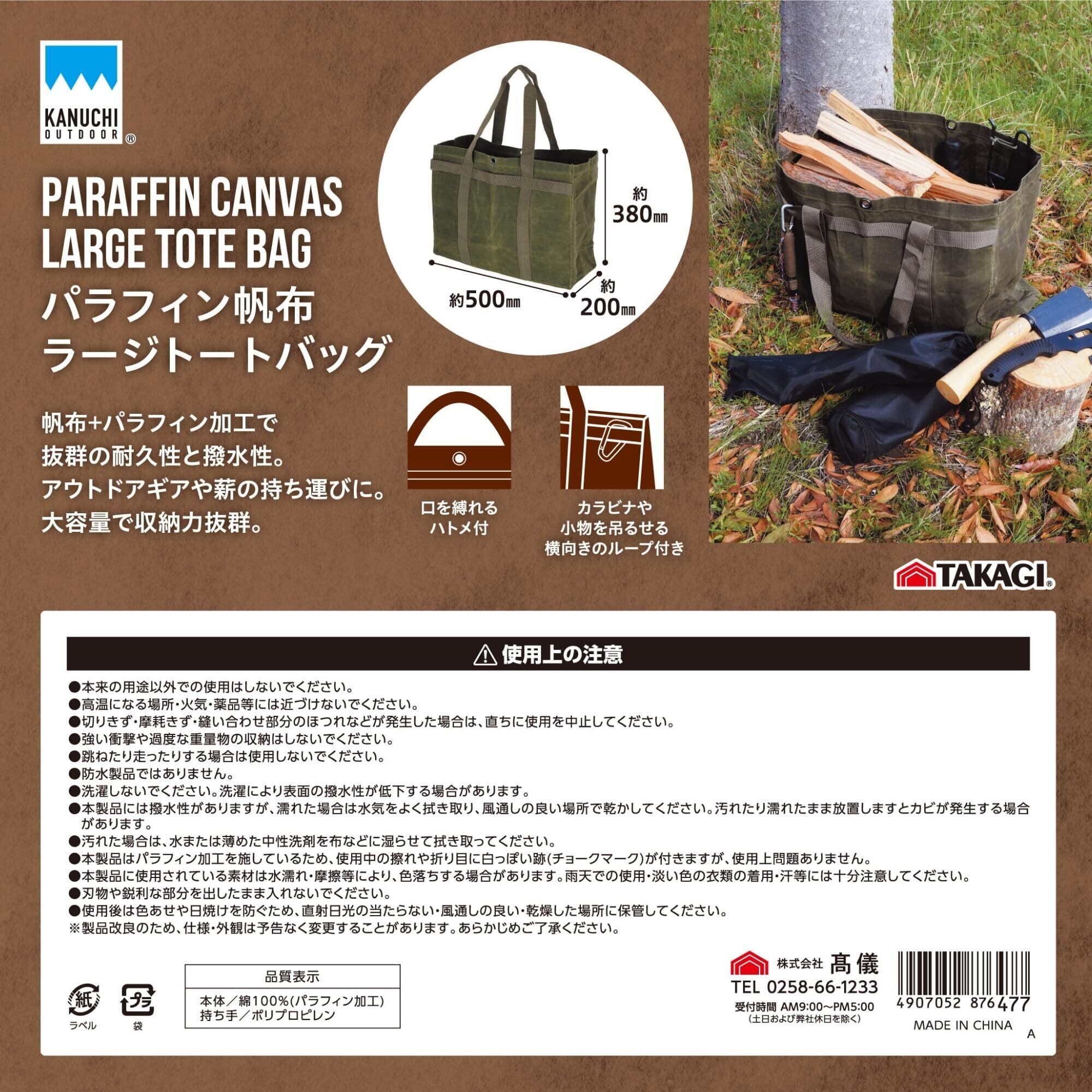 高儀(Takagi) KANUCHI OUTDOOR パラフィン帆布 ラージ トートバッグ カーキ 口を縛れるハトメ付き 横向きのループ付き 耐久性 撥水性 収納力 大容量 鞄 アウトドア キャンプ 薪バッグ 薪ケース ツールバッグ 持ち運び
