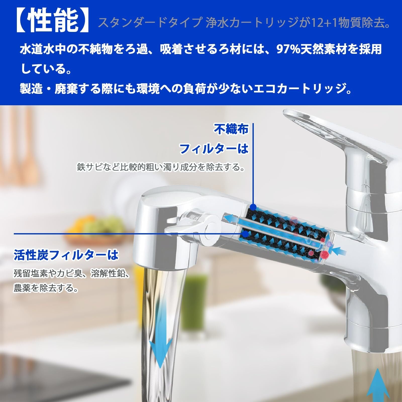 【性能】スタンダードタイプ 浄水カートリッジが12+1物質除去。不織布フィルターは鉄サビなど比較的粗い濁り成分を除去する。活性炭フィルターは残留塩素やカビ臭、溶解性鉛、農薬を除去する。