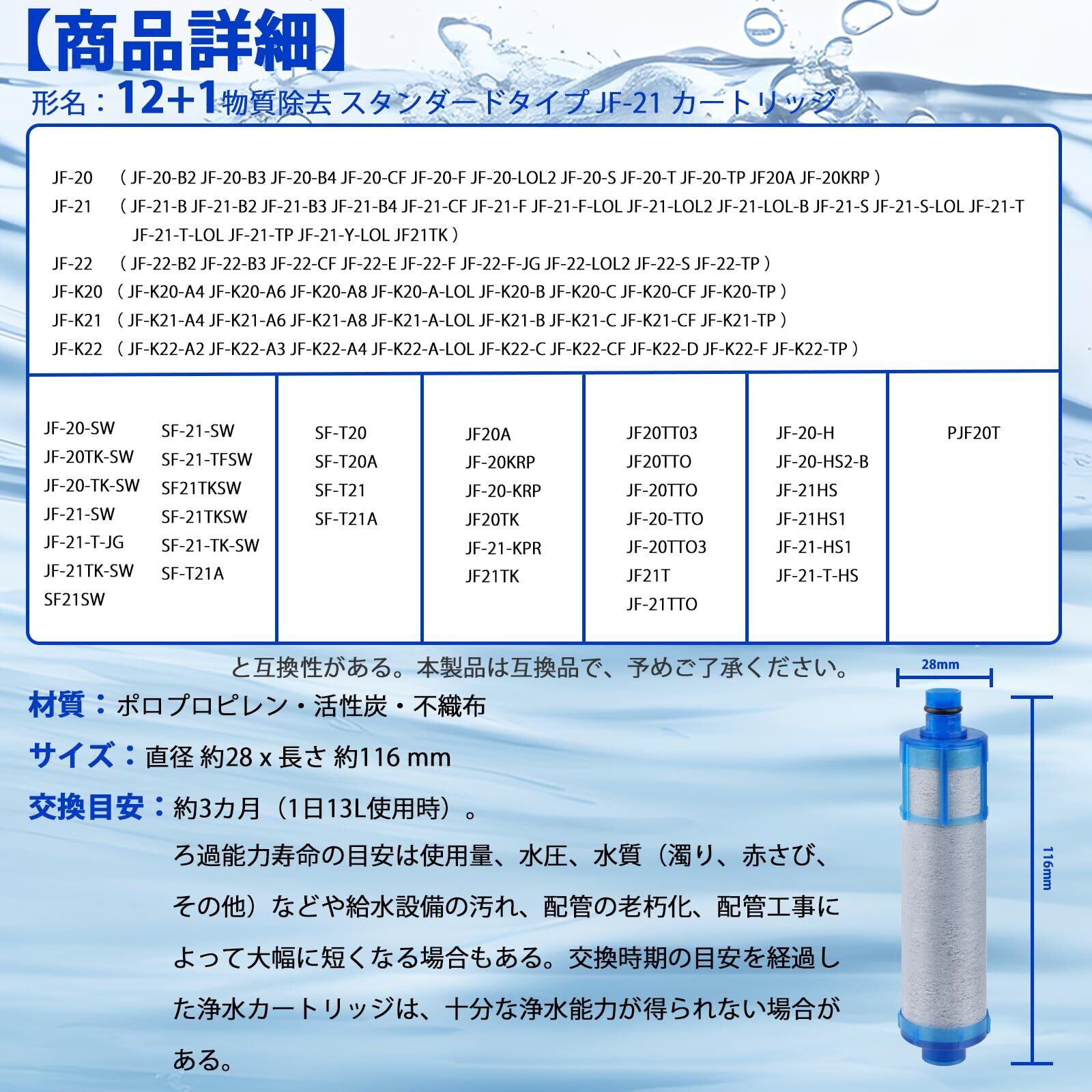【形名】 12+1物質除去 スタンダードタイプ JF-21 カートリッジ ( JF-20 JF-22 JF-K20 JF-K21 JF-K22 と互換性がある) 。材質:ポロプロピレン・活性炭・セラミック・不織布。