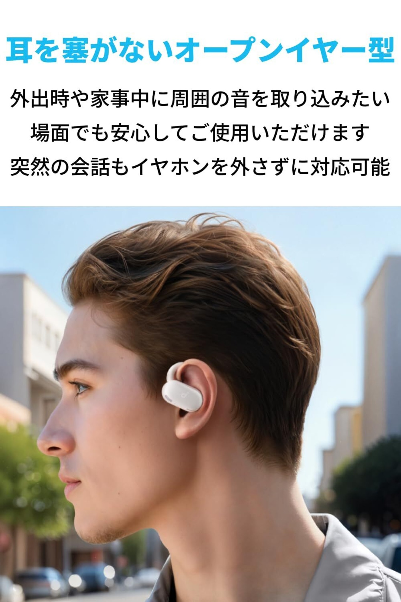 耳を塞がないオープンイヤーイヤホン:外出時や家事中に周囲の音を取り込みたい場面でも、安心してご使用いただけます。突然の会話にもイヤホンを外さずに対応可能です。