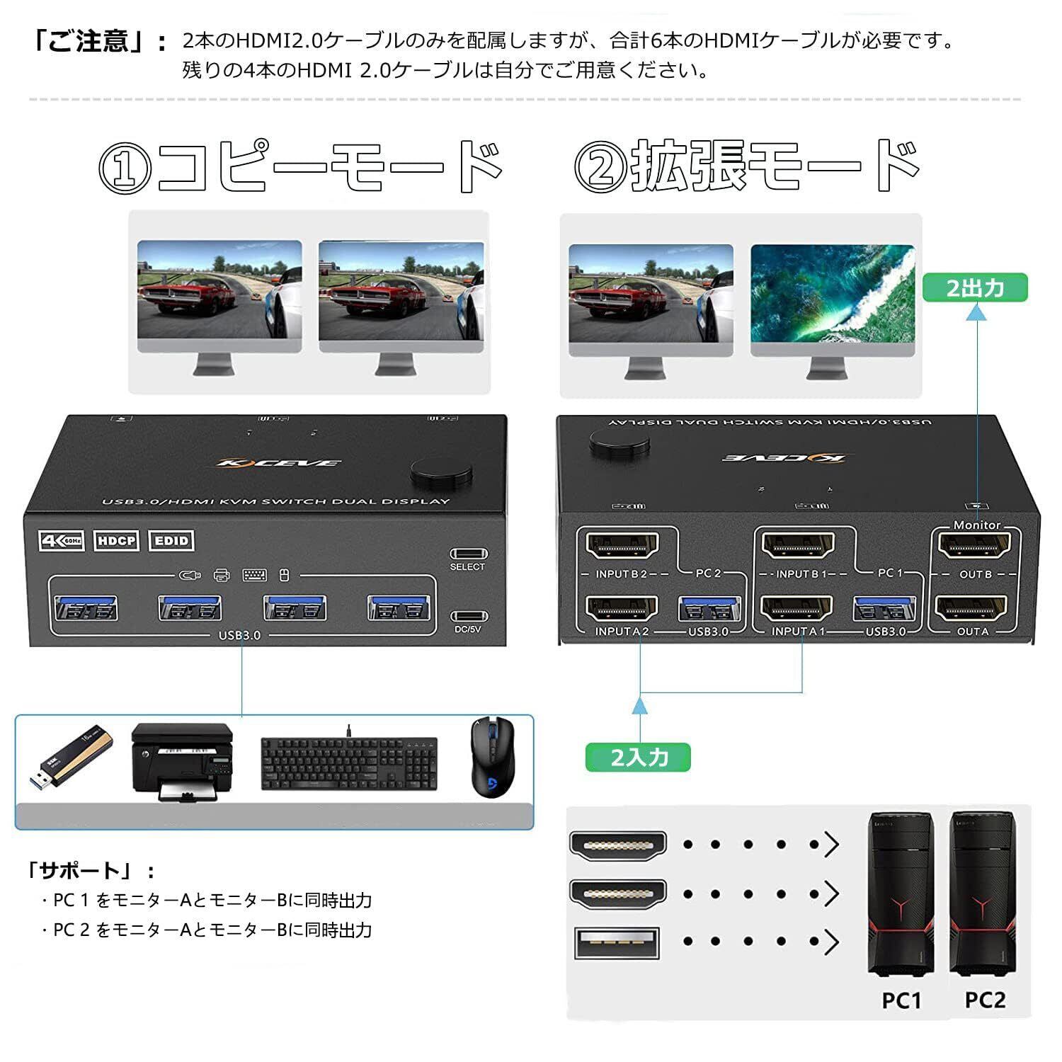 KCEVE デュアル モニター KVM切替器 USB3.0 コピー/拡張モード 4K@60Hz解像度 EDID機能 2PC間でキーボード、マウス、デュアルディスプレイを共有 USB/HDMIケーブルと手元スイッチ付き