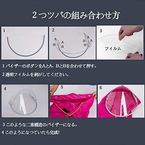 硬い二重つば:ツバ部分は、顔が濡れにくい、女性には綺麗なお化粧崩れも心配ありません。ツバは硬い素材で加工され、顔を覆ってなくて視界が良好です。 フードに重みはある透明の雨よけがついて、風が吹いても大丈夫で、視界が保障できます。最初はあまりに不透明で汚れもあり、不良品かとガッカリしましたが、違いました!薄いフィルムが両面に貼られていて、はがしたら綺麗!