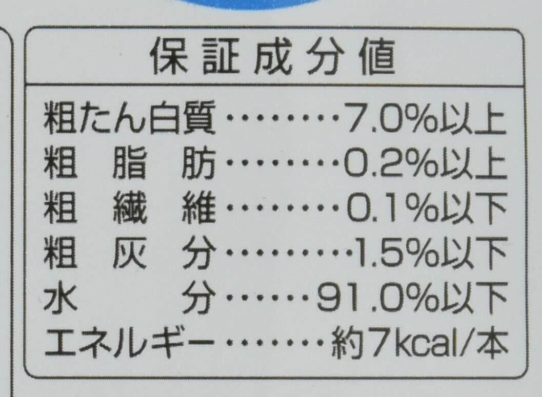 鶏肉(ささみ)、いか、いかエキス、タンパク加水分解物、糖類(オリゴ糖等)、植物性油脂、増粘剤(加工でん粉)、ミネラル類、増粘多糖類、調味料(アミノ酸等)、ビタミンE、紅麹色素、緑茶エキス