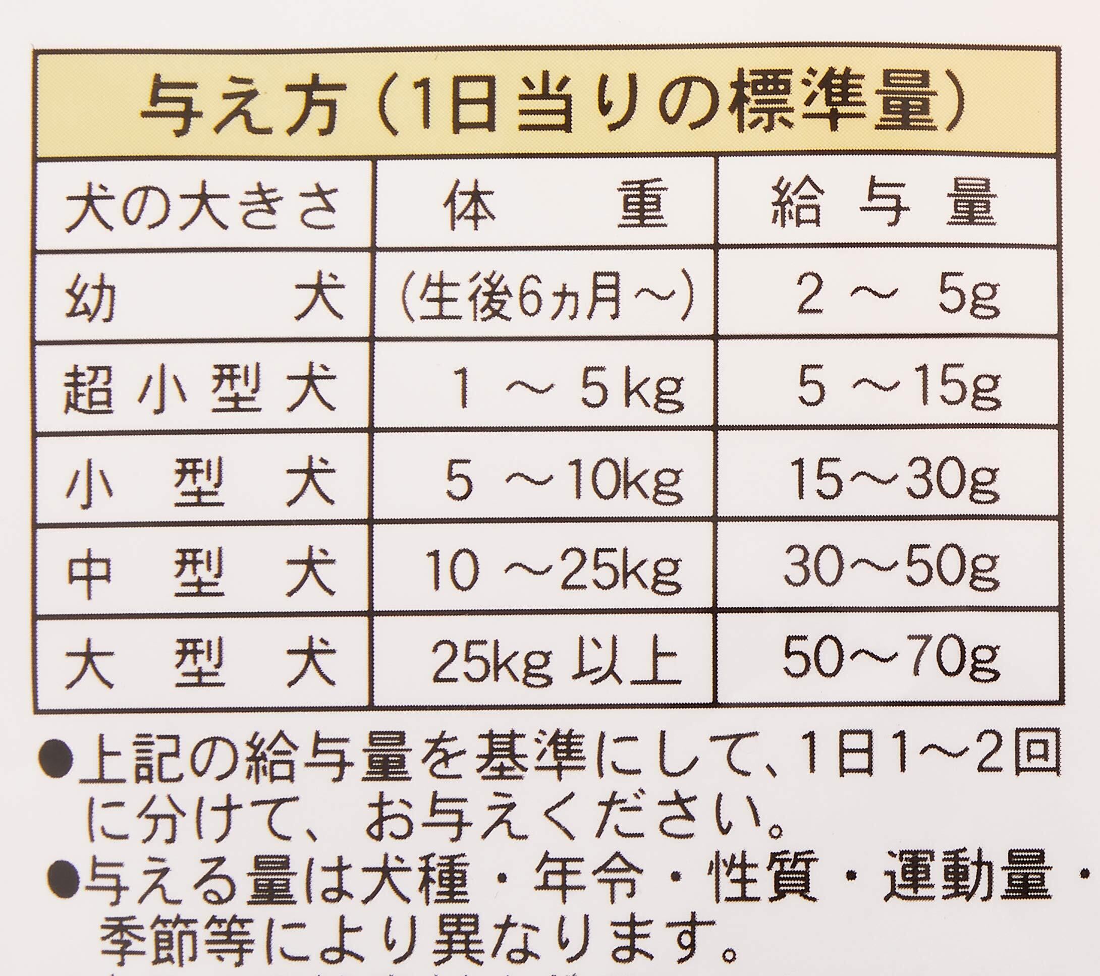 幼犬生後6ケ月より(2~5g)、超小型犬(5~15g)、小型犬(15~30g)、中型犬(30~50g)、大型犬(50~70g)、愛犬の食べ方や習性によっては、のどに詰まらせることがありますので必ず観察しながらお与えください。その他パッケージ記載の与え方を参照願います。
