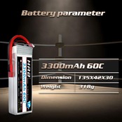 バッテリー素材:リチウムポリマー、セル電圧:3.7〜4.2V、セル:4S、電圧:14.8V、容量:3300mAh、放電:60C、放電プラグ:Deans T
