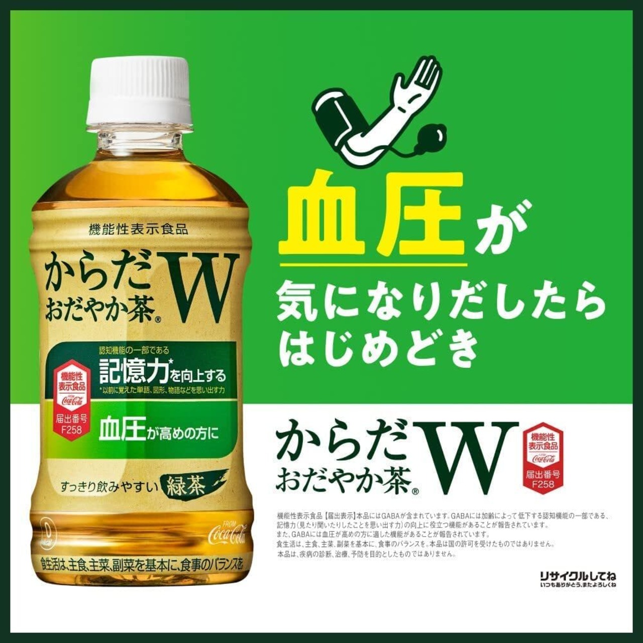 GABA100mgを配合した、記憶力や血圧が気になる方におすすめする日本初の機能性表示食品の無糖茶 『からだおだやか茶W』が新登場。 ほどよい渋みとすっきり飲みやすい味わいで、毎日続けられるおいしさを目指しました。