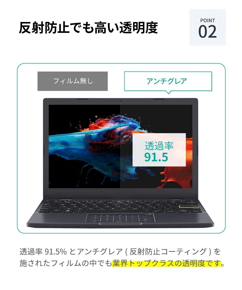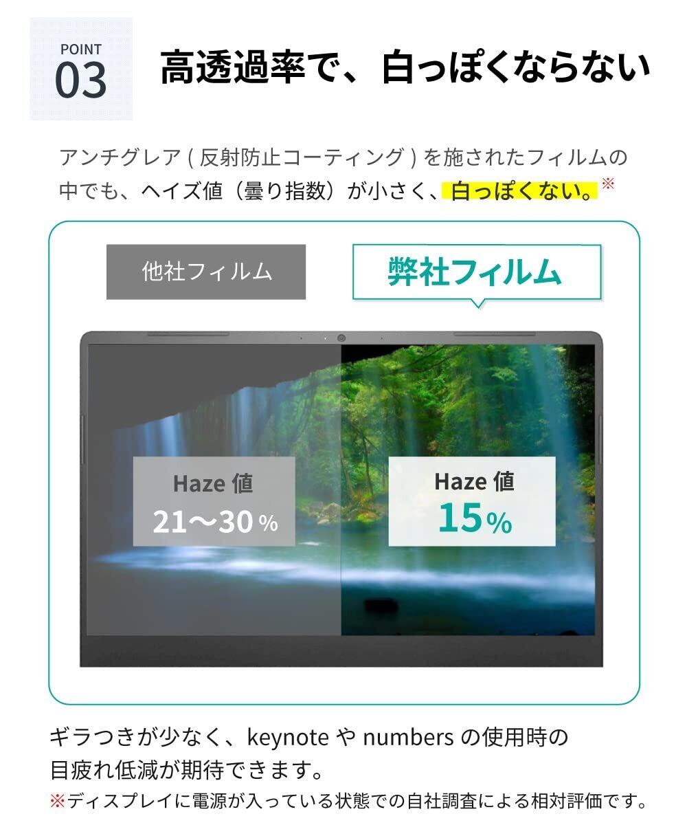 【反射防止】 低干渉対策を施した高透過率のPETフィルムです。一般的なアンチグレアフィルムより透過率90%で色付きやも曇りも少なく綺麗な透明感。