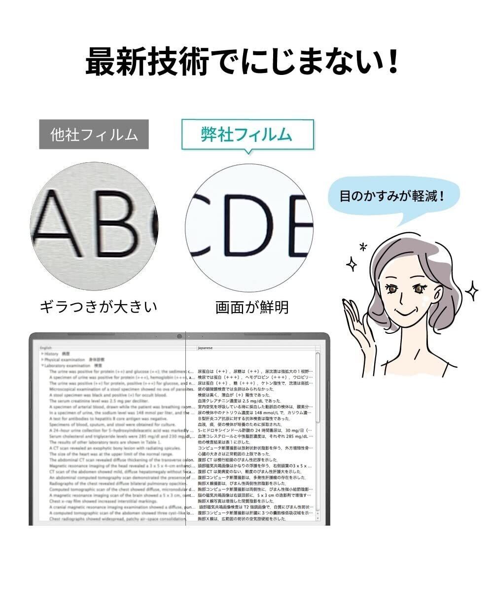 【高精細】 フィルム表面にミクロな網目状組織を形成させることで、文字がにじんで見えたり、ギラついたりしないにも関わらず高い反射防止効果を有するフィルム。世界中を探してもどこにもない日本の中小企業の底力がこのフィルムに集約されています。