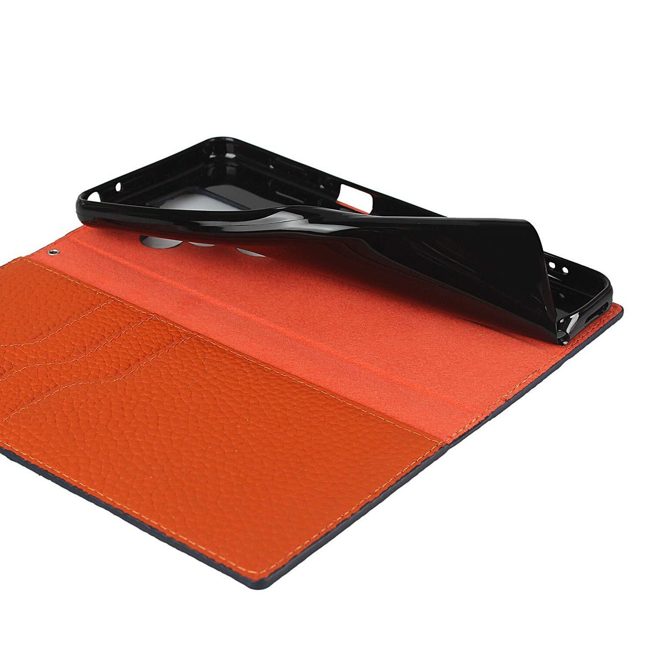 【素材】: シンプルさと高級感を兼ね備えたデザイン, 外殻は牛革製品 本革レザーを採用しており, 内側はスマートフォンにフィットし、隙間なくそれを保護するソフトTPUシリコーン材料で作られています。
