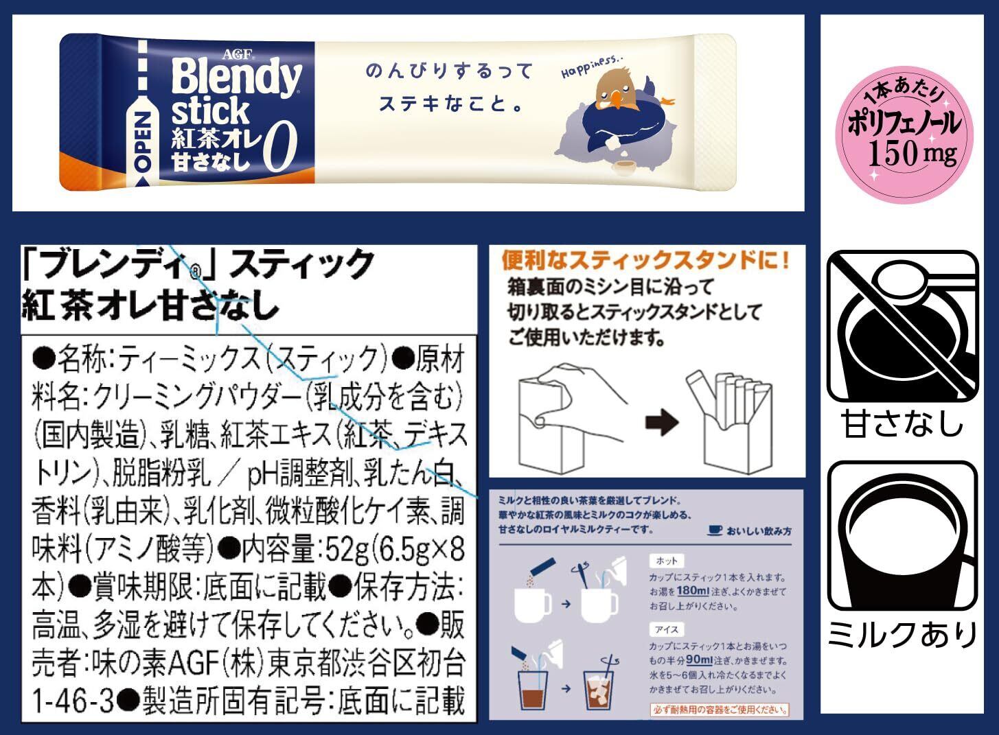 【ブレンディスティック 紅茶オレ糖質オフ】クリーミングパウダー(乳成分を含む)(国内製造)、砂糖、脱脂粉乳、紅茶エキス、デキストリン / pH調整剤、乳たん白、香料(乳由来)、乳化剤、甘味料(アスパルテーム・L-フェニルアラニン化合物、アセスルファムK)、微粒酸化ケイ素、調味料(アミノ酸)