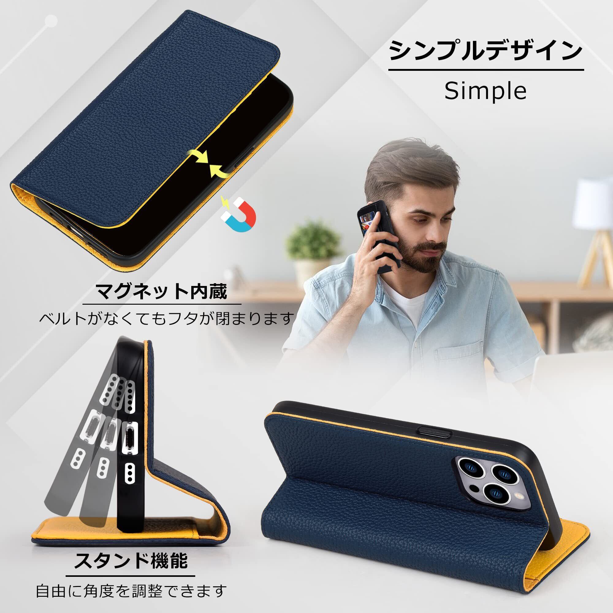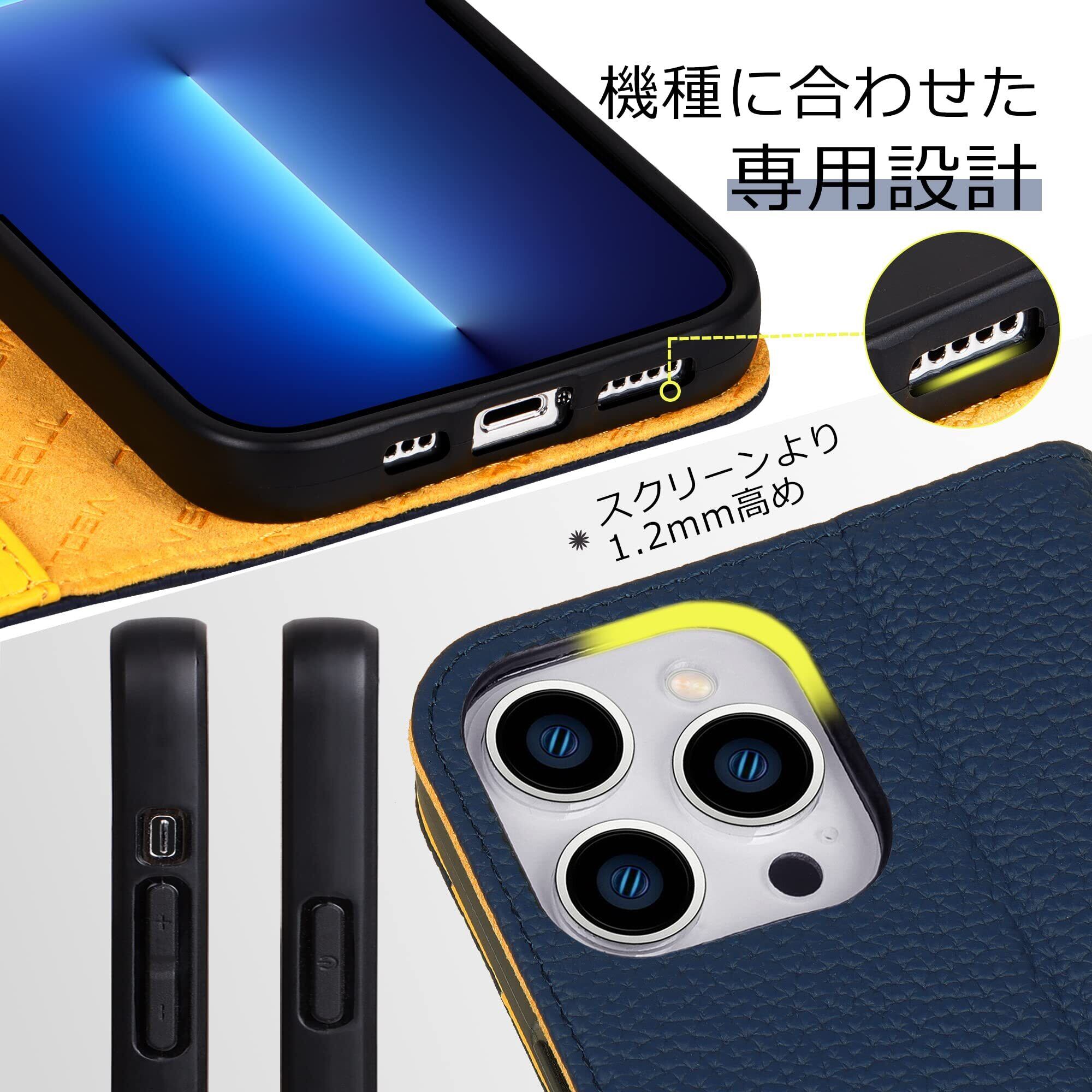 VISOUL iPhone13 Pro ケース 手帳型 本革 アイフォン13 プロ本革ケース レザー スマホケース iPhone 13 Pro 手帳ケース カード収納 携帯ケース 全面保護 横置きスタンド iphone 13Pro 対応 6.1インチ シュリンクレザー iPhone 13 Pro ネイビー レモン