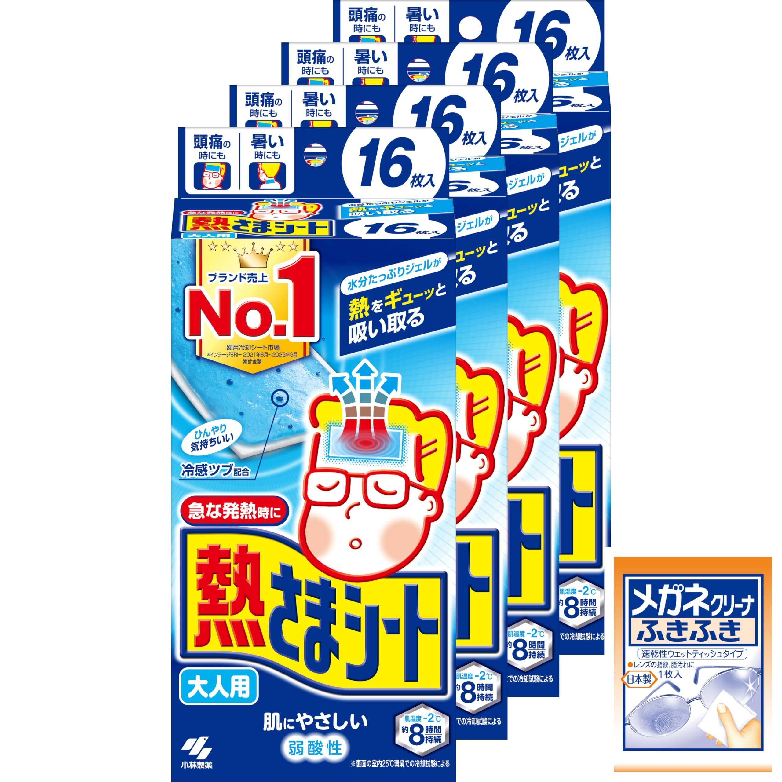【まとめ買い】熱さまシート大人用 冷却シート 肌にやさしい 弱酸性 16枚×4個 メガネクリーナおまけ付
