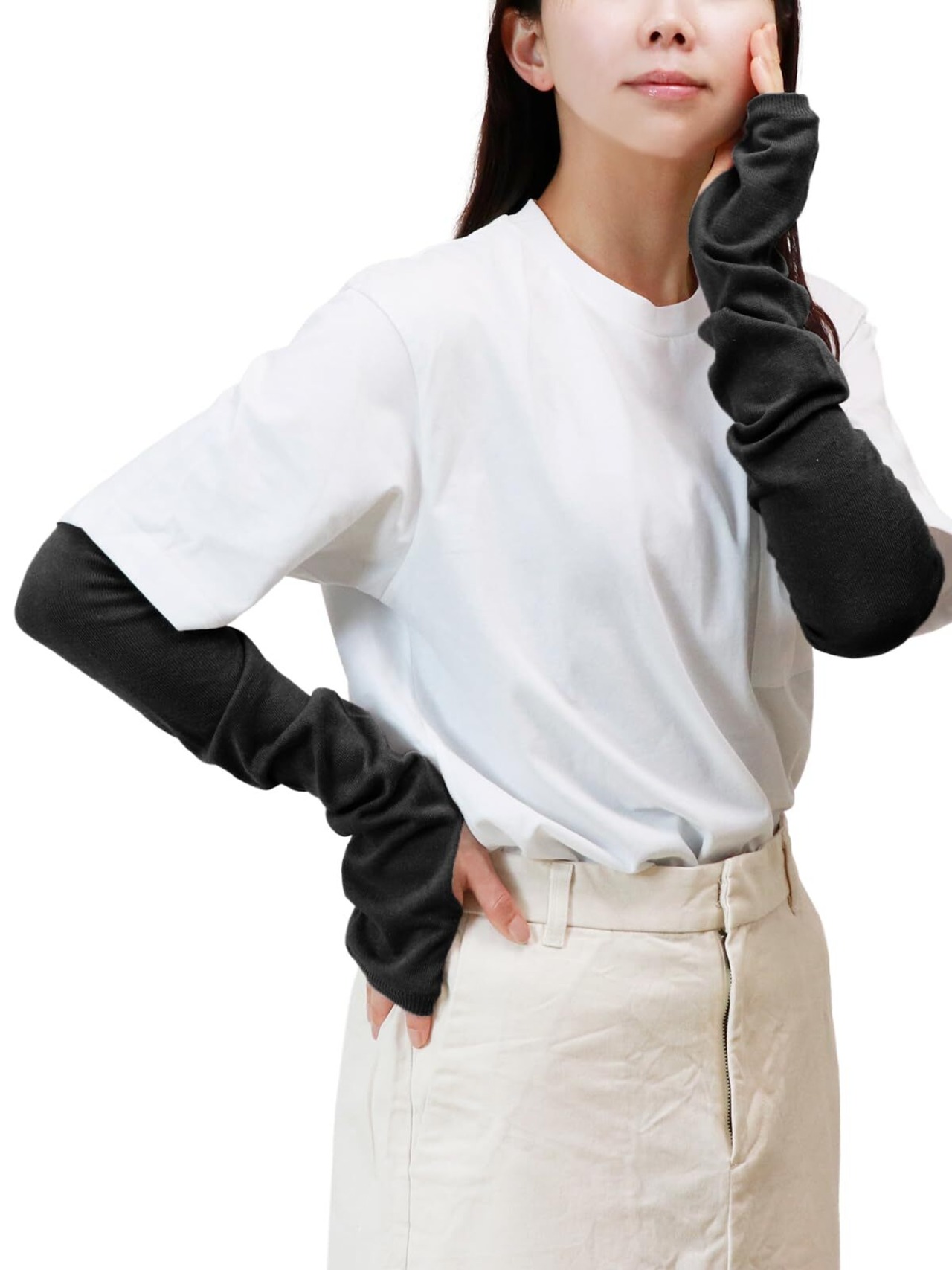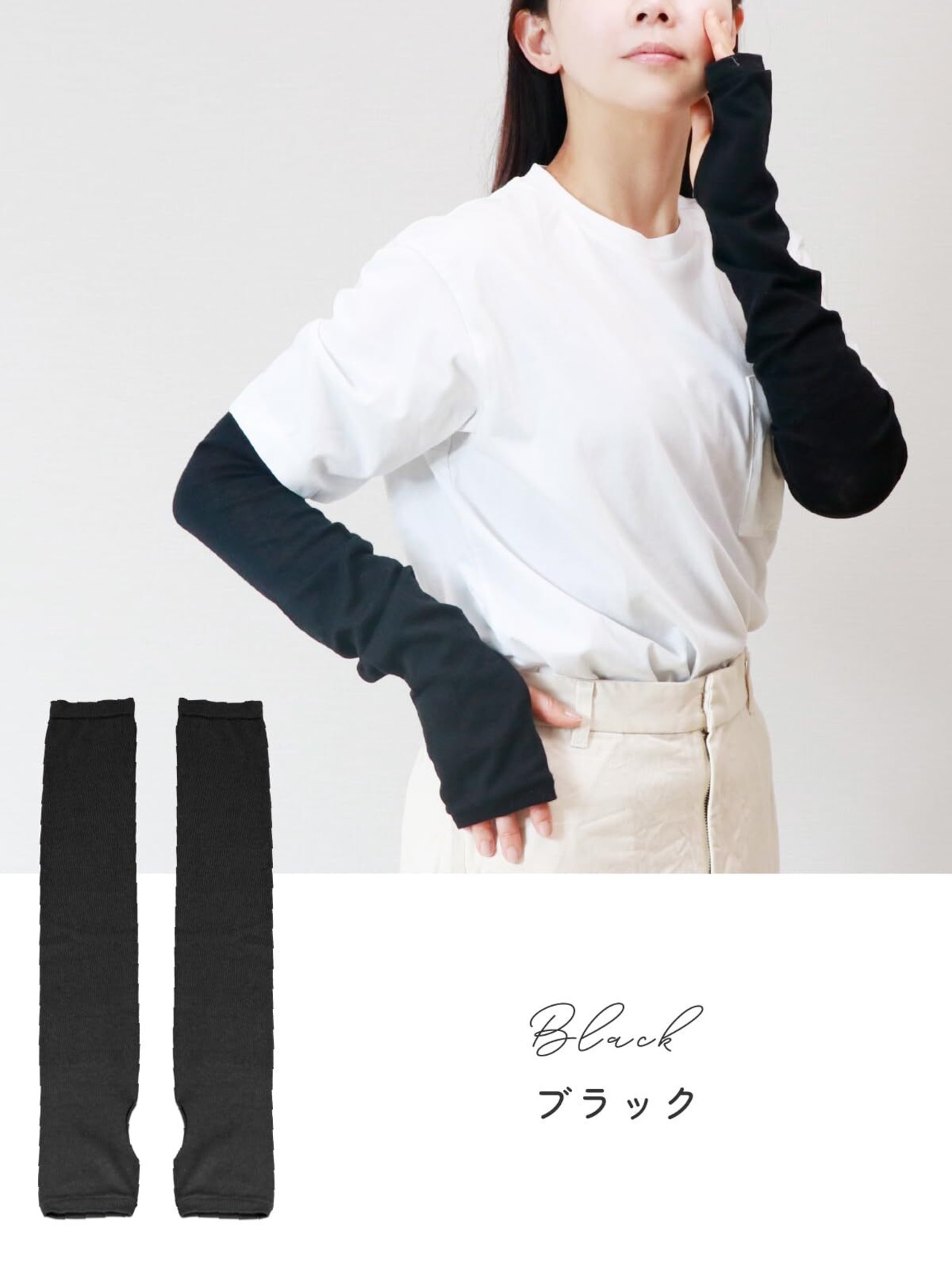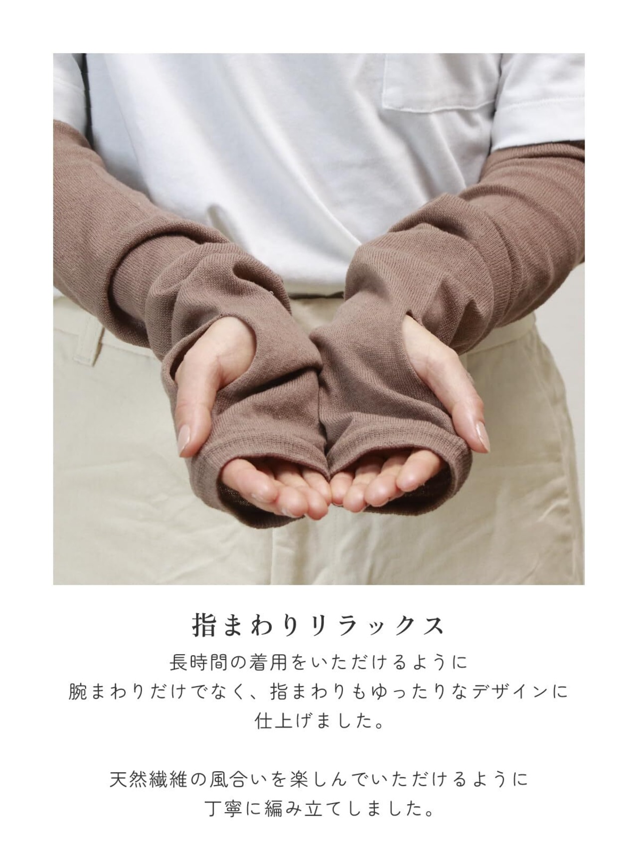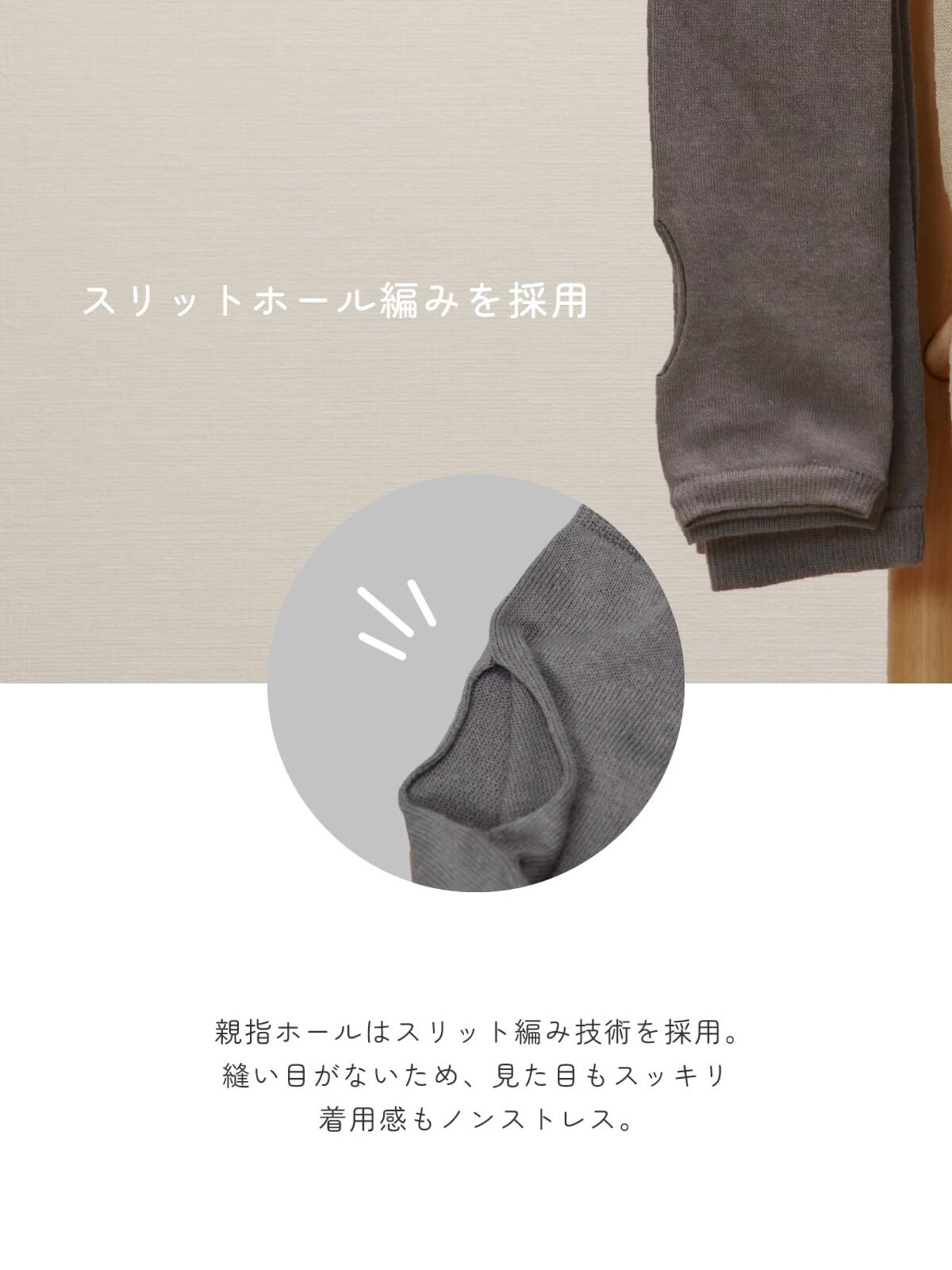 【親指穴スリットタイプ】無縫製で親指穴がシームレスなアームカバーです。快適な着心地を追求して一枚ずつ丁寧に編み立てました。