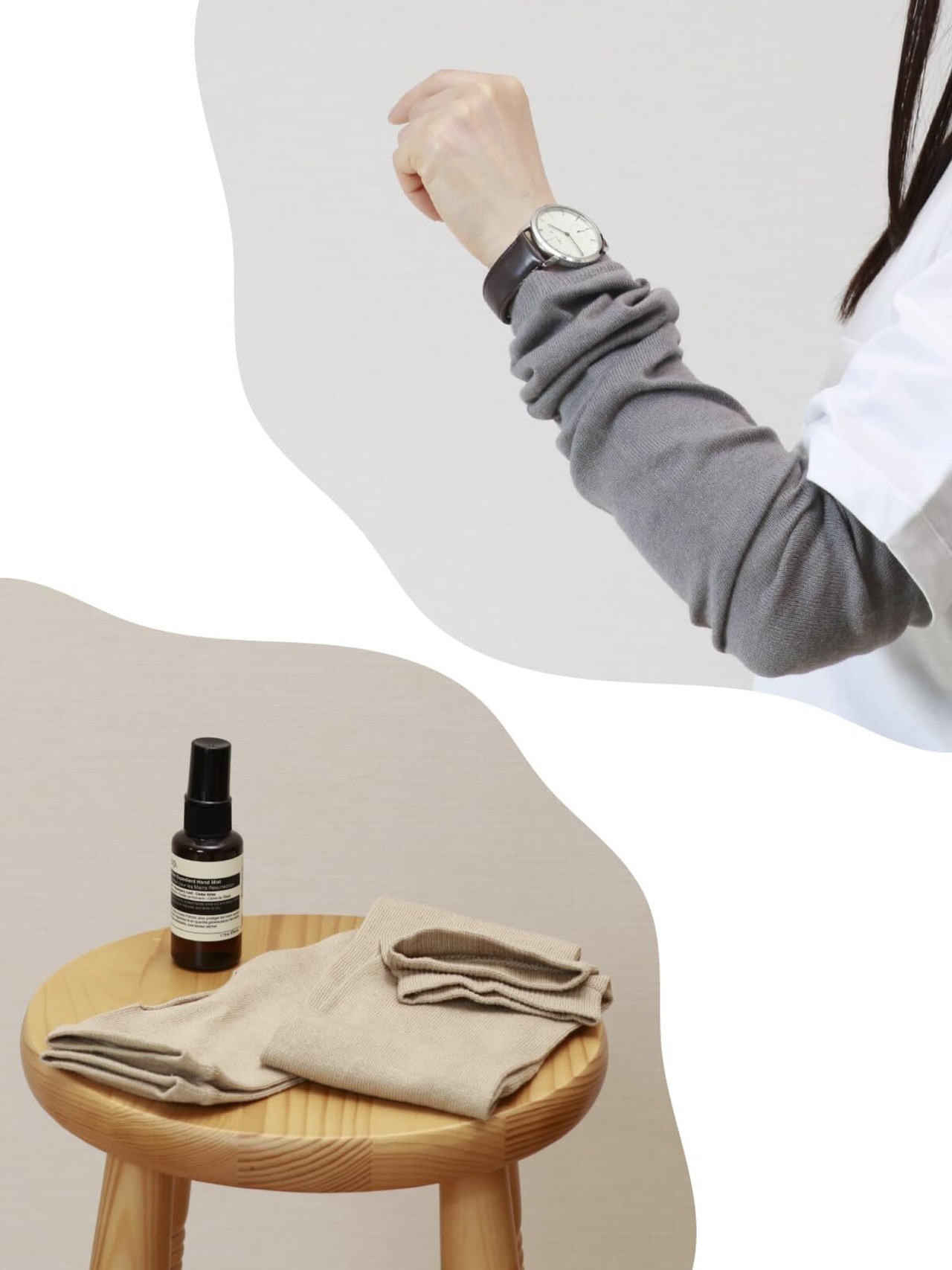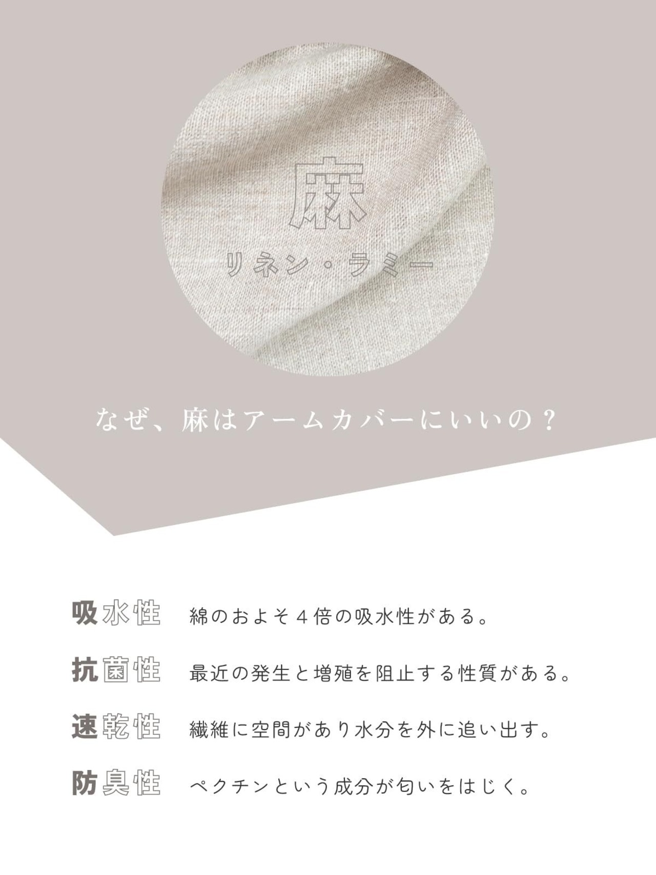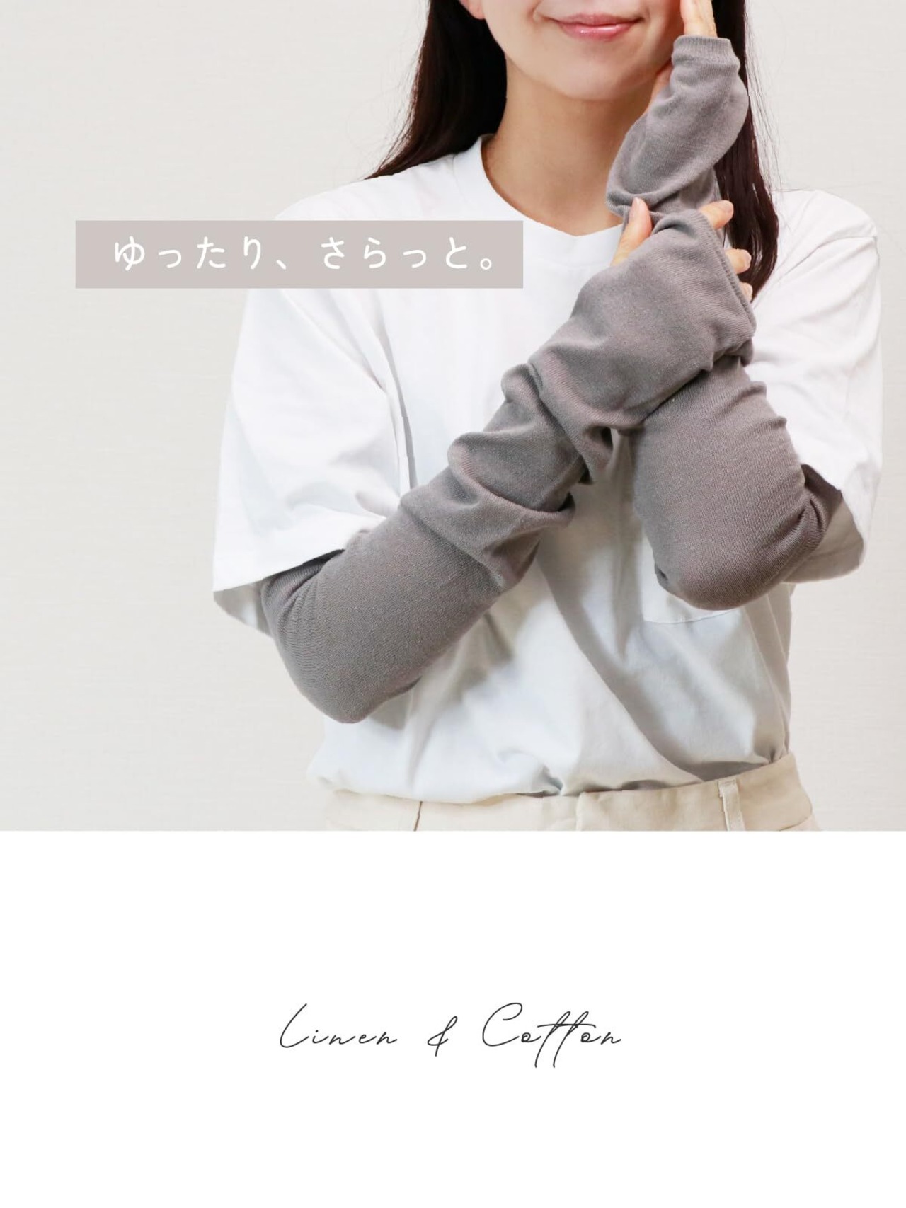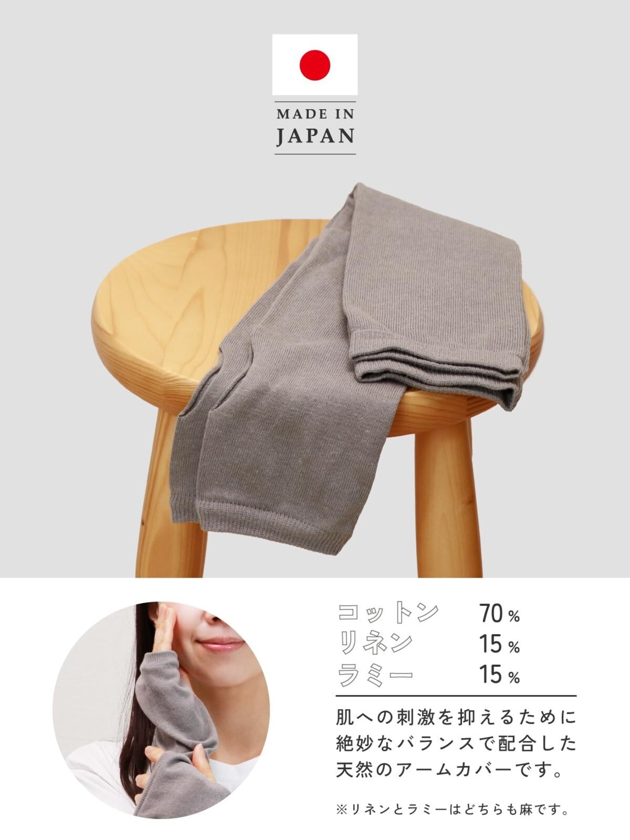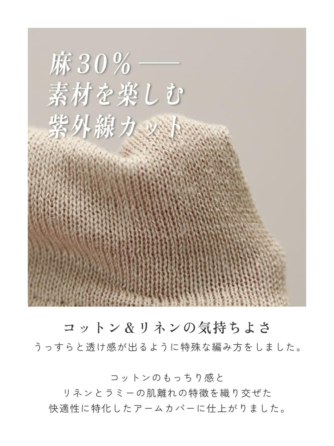 【さらっと快適】麻と綿を絶妙なバランスで配合した肌離れが良いアームカバーです。コットンの柔らかさとリネンのシャリ感をブレンドした糸を使用しました。