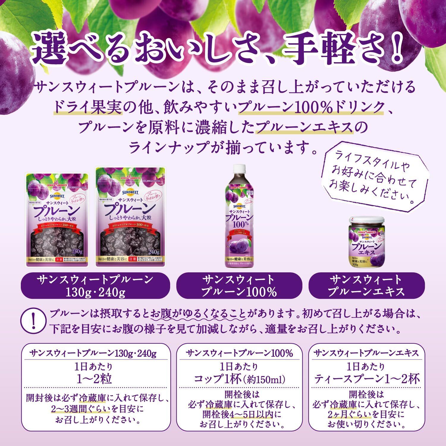 世界で親しまれている米国サンスウィート社の原料を使用したプルーン100%飲料です。砂糖、保存料不使用で1本にプルーンの実約37個分の濃縮汁を使用したこだわりの味と品質です。自然のままのプルーンのおいしさを毎日の健康と美容に。そのままはもちろん、水や牛乳で割ってもおいしくお飲み頂けます。