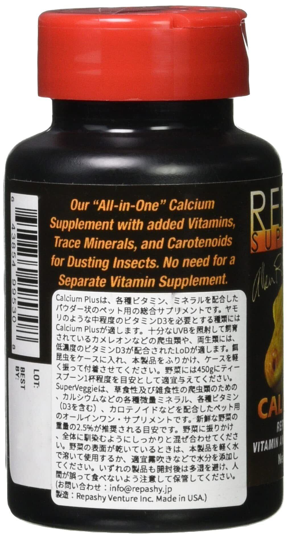 レパシー カルシウムプラスは、多くの爬虫類が通常必要とするレベルのビタミンD3を配合した、爬虫類向けのカルシウムサプリメントです。 ビタミンD3だけでなく、ビタミンA,ビタミンB2、B3、B12などの各種ビタミンB群、ビタミンC、ビタミンEなどの各種ビタミンのほか、各種ミネラルなどを配合し、オールインワンのビタミン&ミネラルサプリメントとなっています。 ヒョウモントカゲモドキやツギオミカドヤモリなどのヤモリや、各種のトカゲなどに昆虫を餌として与えるさいにご使用ください。 3ozボトルは、キャップがワンタッチ開閉できるものにリニューアル。開けるとコショウ瓶のように小さい穴が複数あいているものとなっており、適量を振って出しやすくなっています。