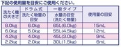 [洗たく機の大きさ] 2.2kg/[ドラム式の洗たく物量の目安] 2.0kg/[一般タイプ水量の目安(洗たく物量)] 30L(1.5kg)/[使用量の目安] 6ml