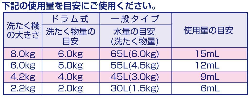 [洗たく機の大きさ] 8.0kg/[ドラム式の洗たく物量の目安] 6.0kg/[一般タイプ水量の目安(洗たく物量)] 65L(6.0kg)/[使用量の目安] 15ml