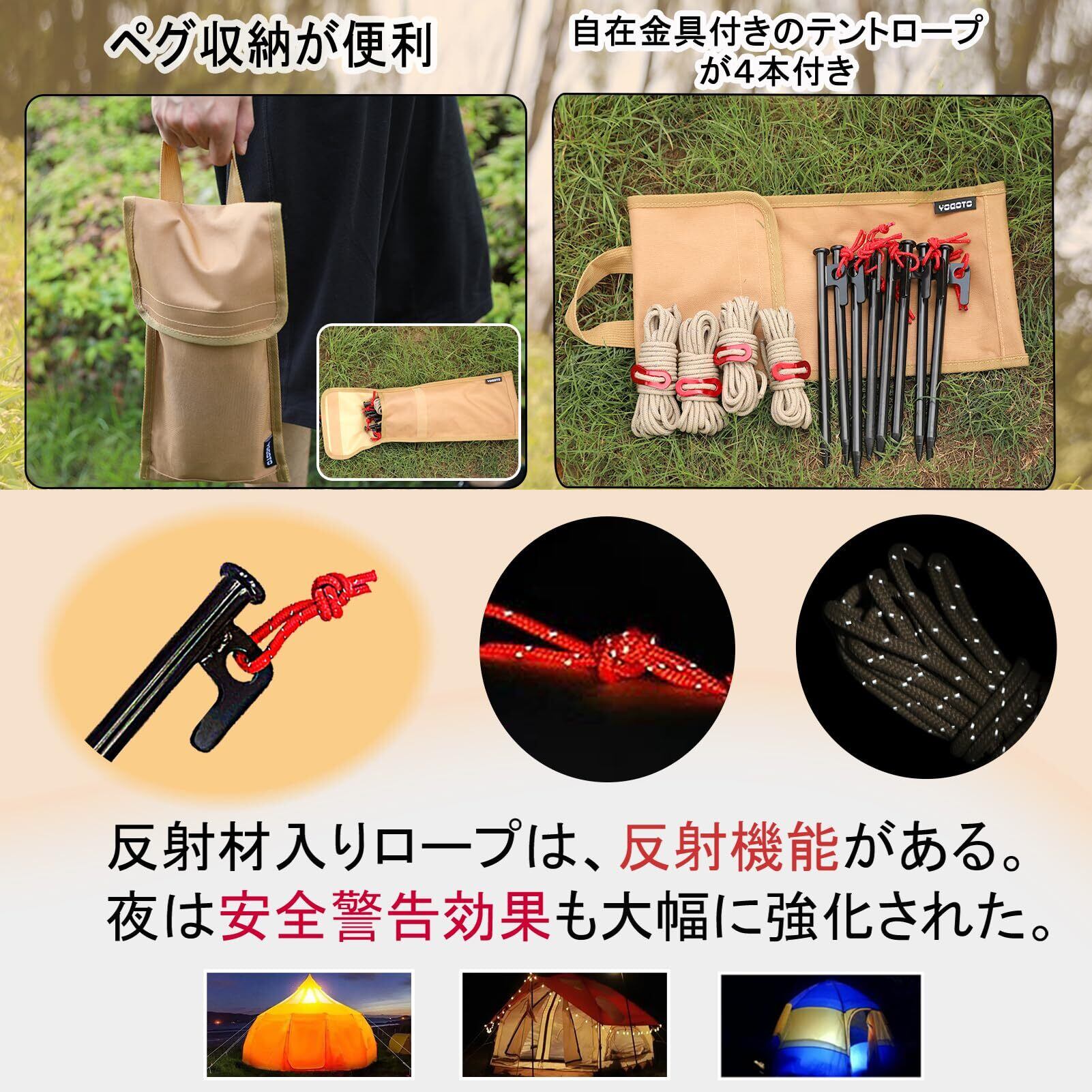 【多用途なセット内容】20㎝ペグ 8本+テントロープ4本+収納袋 、ソロキャンプから家族でのアウトドア、イベント設営に至るまで幅広い用途に対応する。