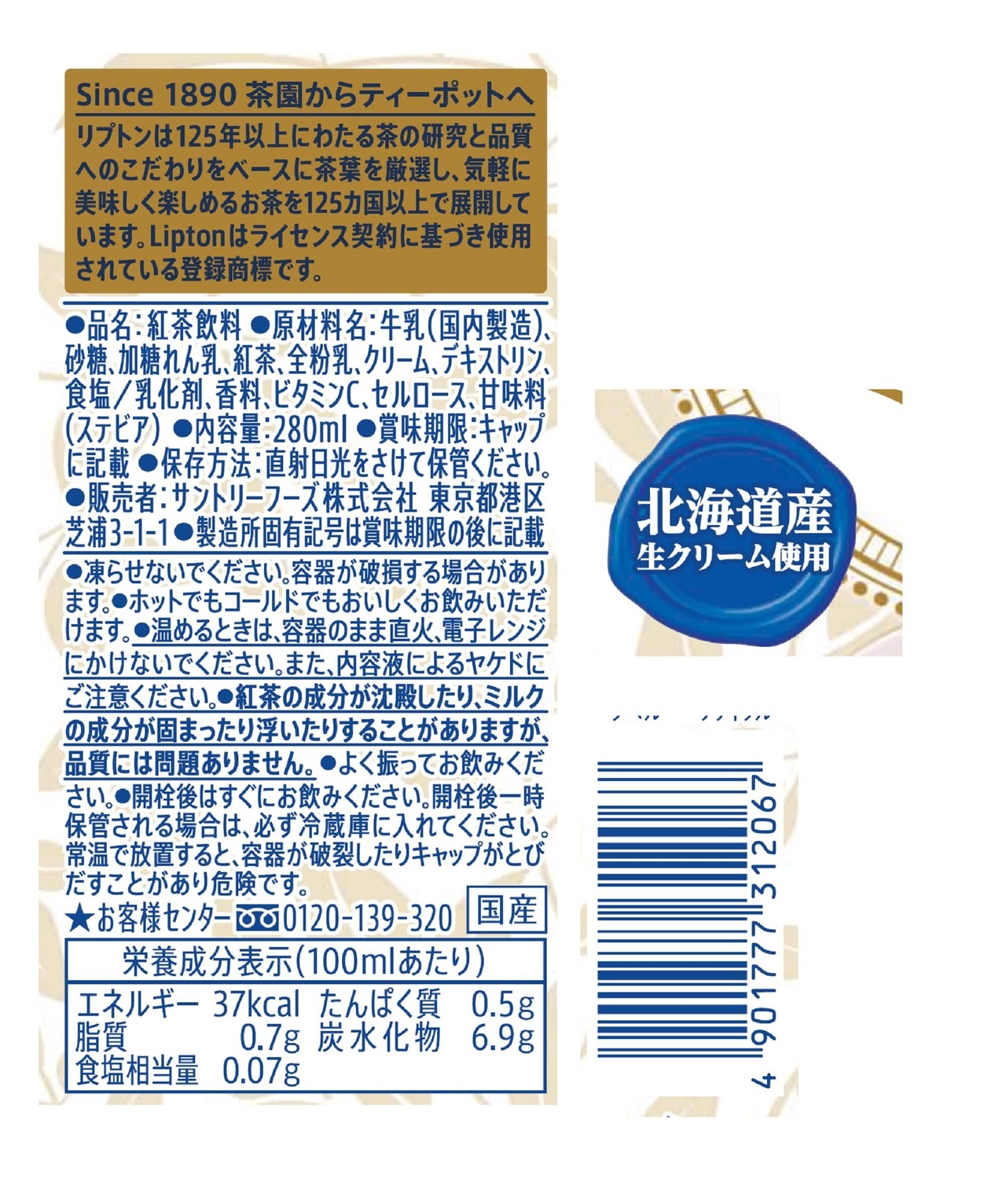 原材料:牛乳(国内製造)、砂糖、加糖れん乳、紅茶、全粉乳、クリーム、デキストリン、食塩/乳化剤、香料、ビタミンC、セルロース、甘味料(ステビア)