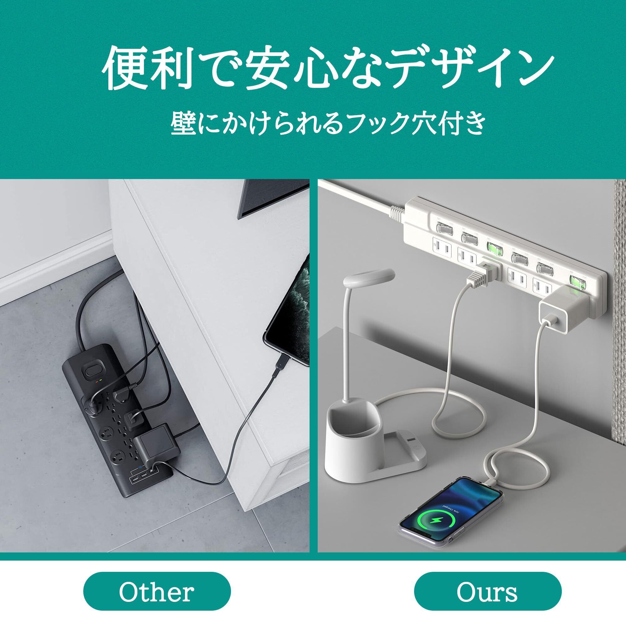 【優しいデザイン】 ■差込口6個:ACコンセント6個口。コンセント不足を一気に解消します。 ■幅広アダプタ用差し込み口:幅広のACアダプタも使用できるよう1箇所のコンセント間隔を広く設計しています。 ■ECO省エネ:接続機器ごとにON/OFFでき、待機電力を節約できる個別スイッチ付。コンセントを抜き差しすることなく、電源をこまめにON・OFFできます。 ■LED付スイッチ:スイッチに備えられたLEDインジケータは、寝室でもお使いいただけるように柔らかく光る仕様です。 ■180°スイングプラグ:狭い場所でも配線しやすく、家具に隠れがちな壁コンセントを無駄にしません。