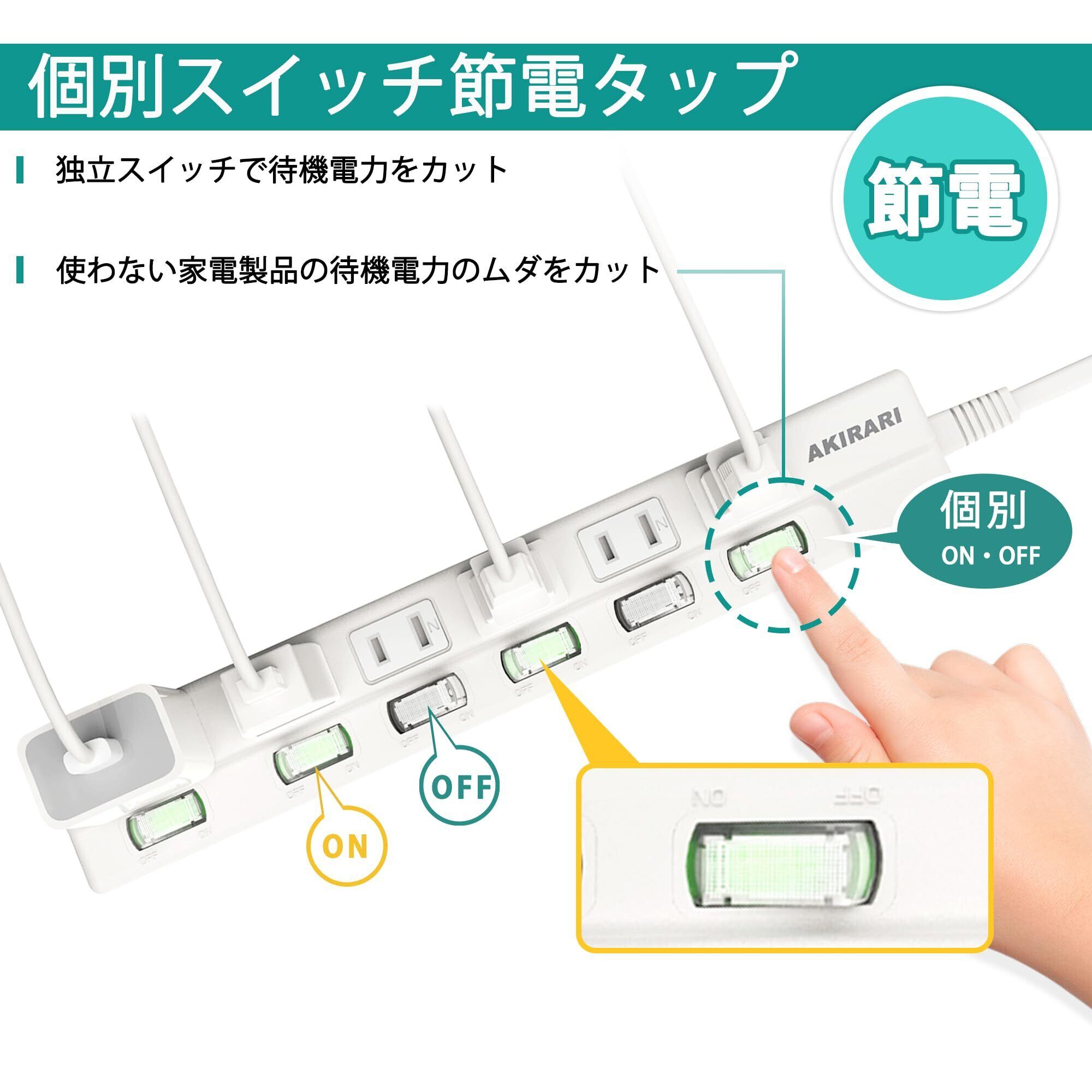 【通電が一目分かる】スイッチが緑に点灯、AC差込口が6個口で、それぞれ個別スイッチが付いています。コンセントを抜き差しすることなく、電源をこまめにON・OFFできます。待機電力がカットでき、節電効果があります。