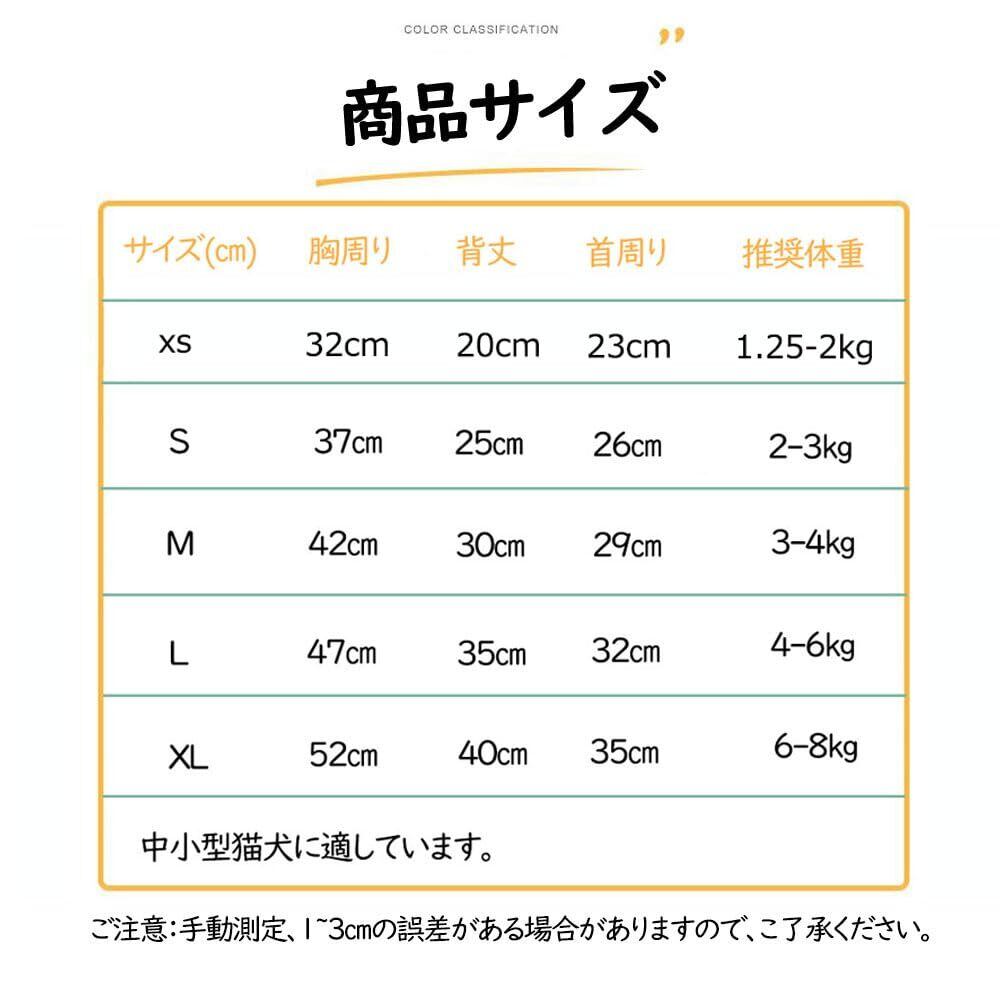 【サイズ】xS:胸周り:32cm 背丈:20cm 首周り:23cm 推奨体重:1.25-2kg、S:胸周り:37cm 背丈:25cm 首周り:26cm 推奨体重:2-3kg、M:胸周り:42cm 背丈:30cm 首周り:29cm 推奨体重:3-4kg、L:胸周り:47cm 背丈:35cm 首周り:32cm 推奨体重:4-6kg、XL:胸周り:52cm 背丈:40cm 首周り:35cm 推奨体重:6-8kg 中小型猫犬に適しています。