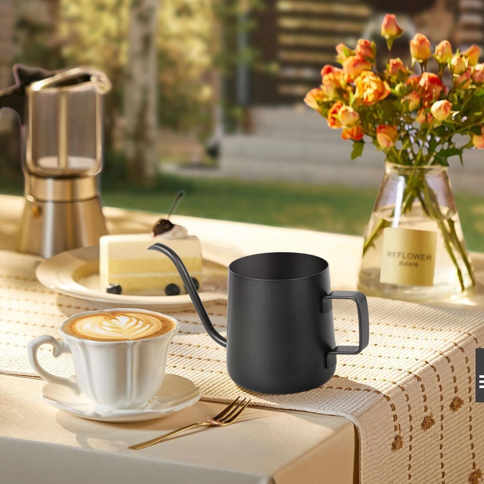 【注ぎやすい細口ポット】コーヒーポットの注ぎ口は細長い白鳥の首のデザインを採用して、内径はわずか5mm、水の流れを柔らかくして、お湯が注ぎやすいし、湯の量をコントロールしやすいです。初心者でも簡単にご利用いただけます。細身の注ぎ口は、コーヒーを一滴一滴丁寧に注ぐことができ、深い味わいと豊かな香りを楽しむことができます。