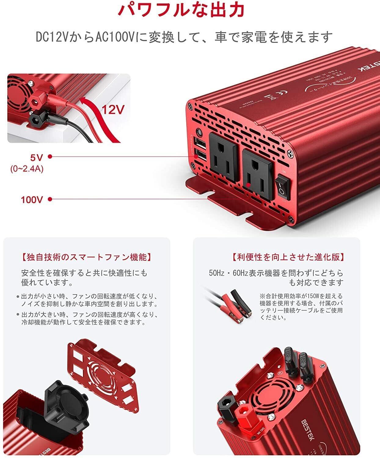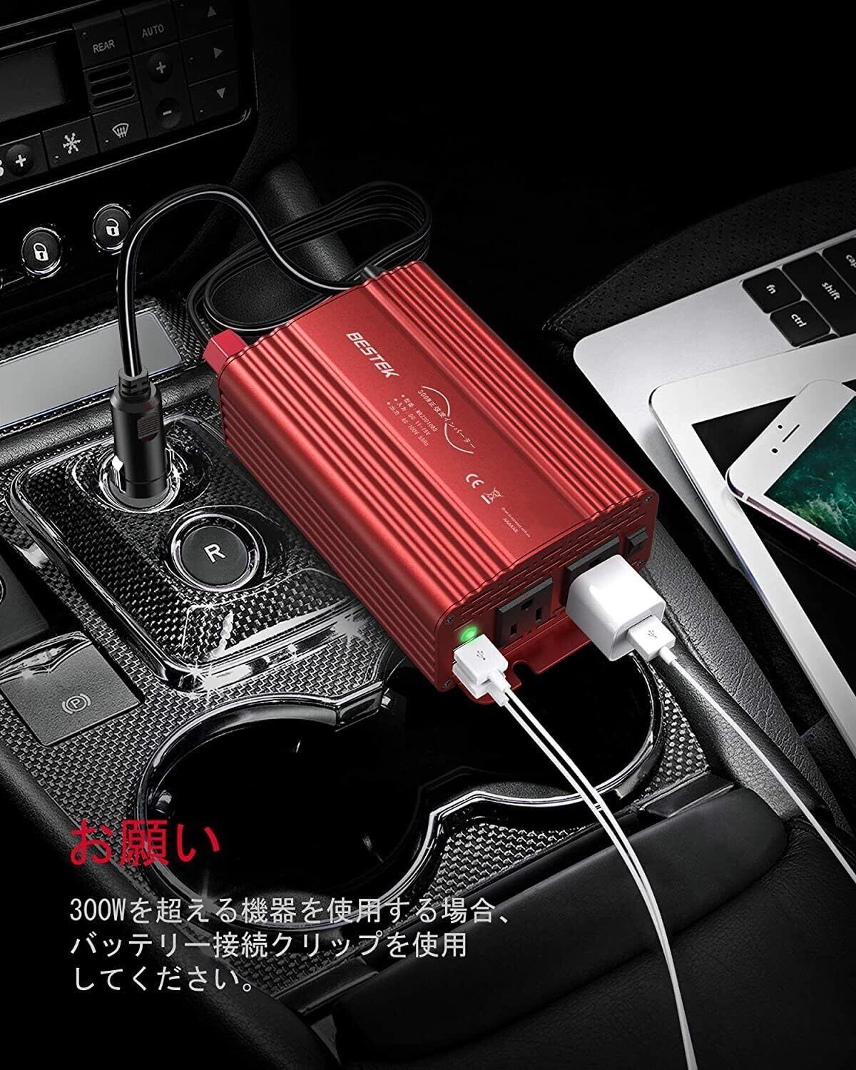 BESTEK インバーター 300W 正弦波 シガーソケット コンセント DC12VをAC100Vに変換 USB2ポート搭載 車載用インバーター カーインバーター A-MRZ3010BU-RD