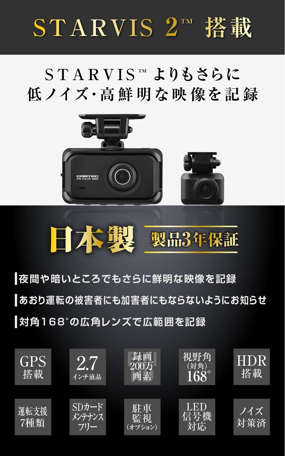 コムテック ドライブレコーダー ZDR055 STARVIS 2搭載で夜間撮影性能向上 前後2カメラ 前後200万画素 FullHD GPS/後続車両接近お知らせ機能/運転支援機能搭載 日本製 3年 常時録画 衝撃録画 駐車監視 高速起動 液晶 [出張取付サービス対応]