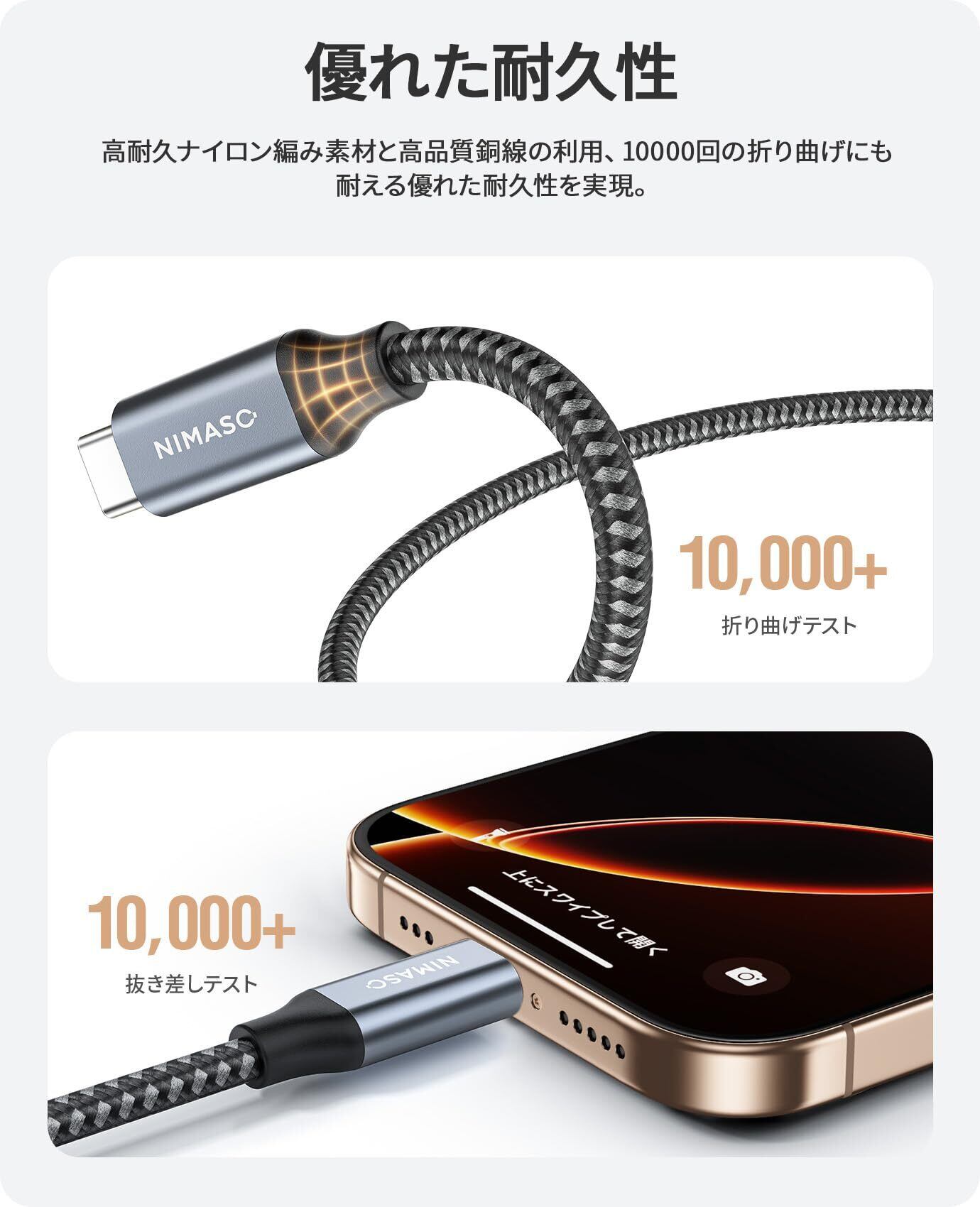 10000回の抜き挿しテスト、 50Nの引っ張り強度テスト、10000回以上の折り曲げテストをクリアし、高耐久ナイロン編み素材を利用しているケーブルです。優れた耐久性のほかに、断線しにくい、絡みにくい、取り回しやすい特徴をも持っています。