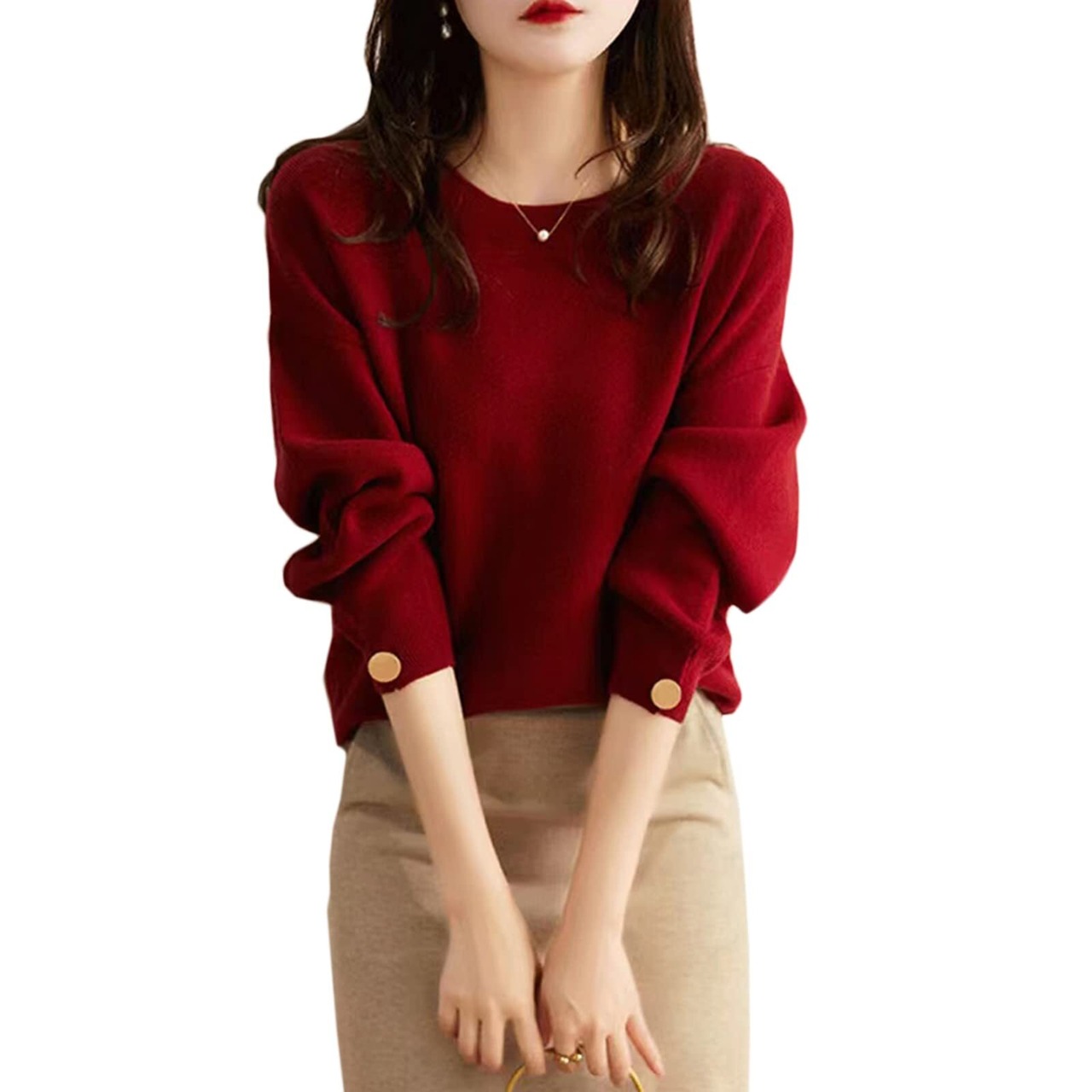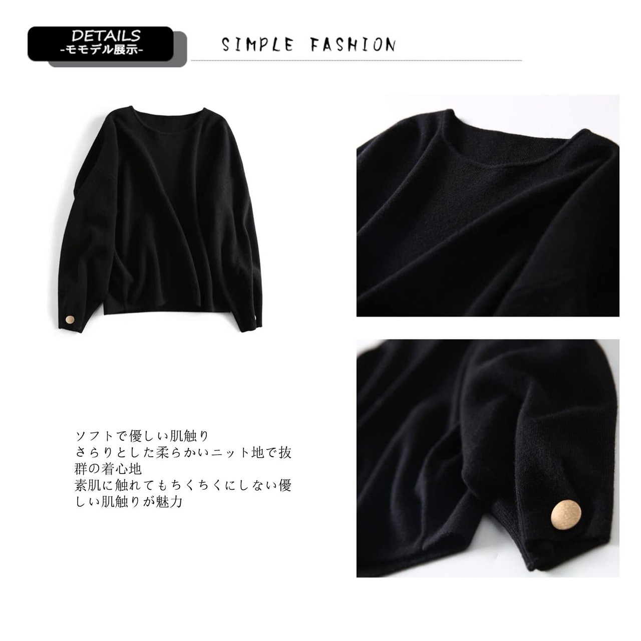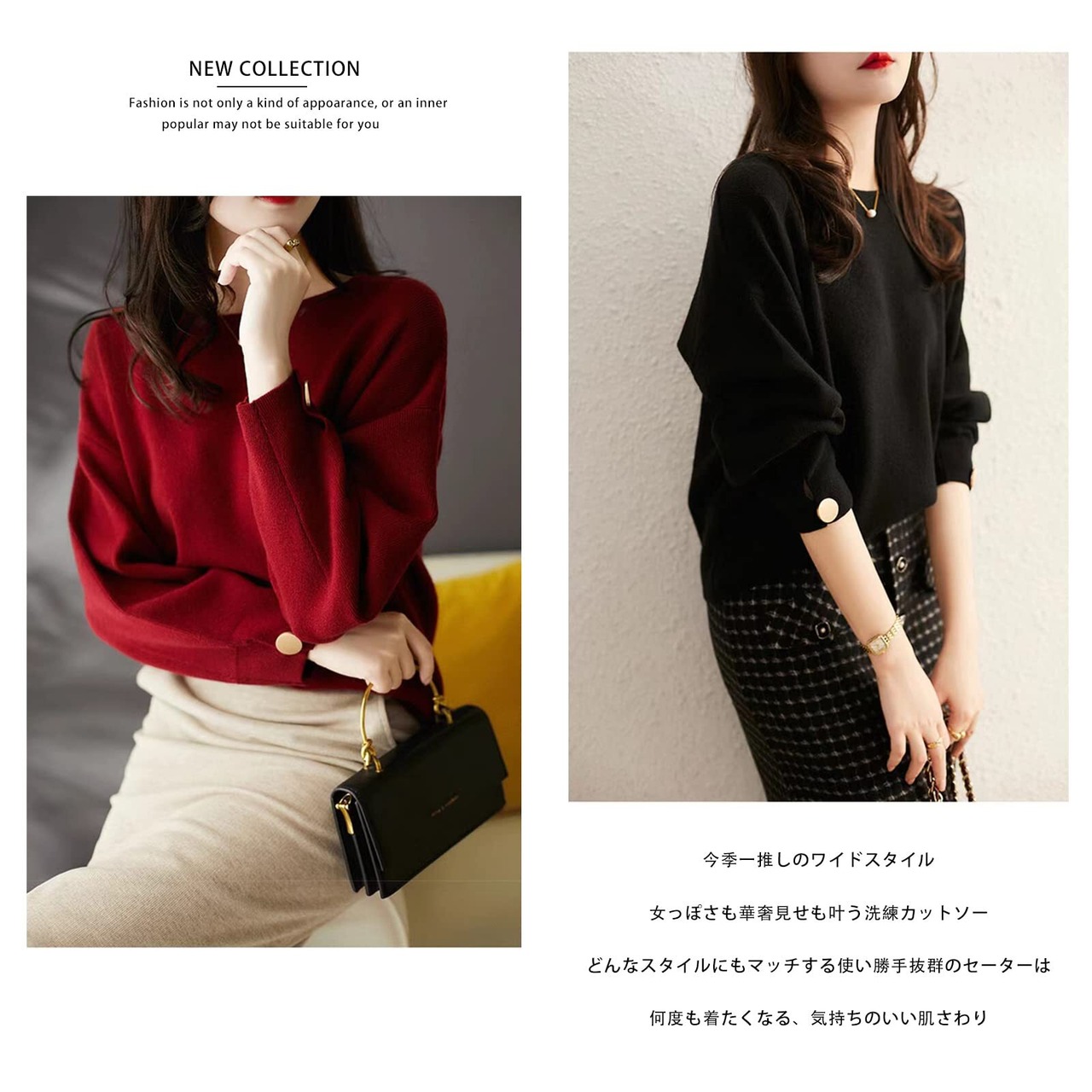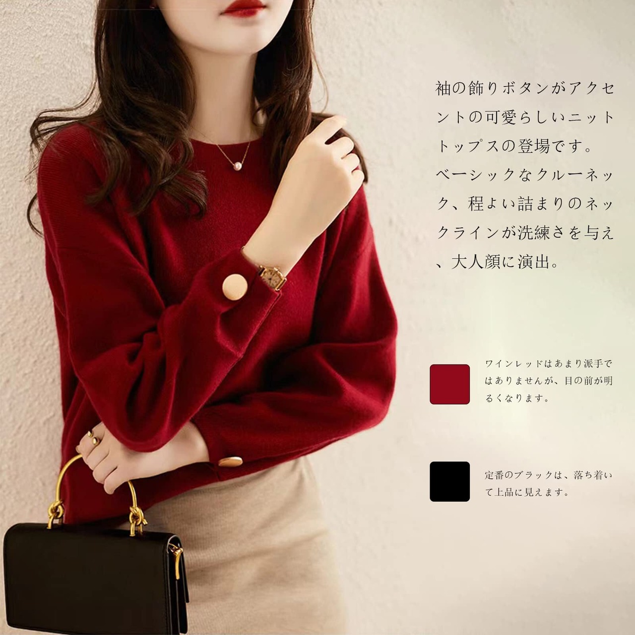 ベーシックなクルーネック、程よい詰まりのネックラインが洗練さを与え、大人顔に演出。カラーは定番のブラックとエレガントなワインレッド。シンプルなデザインに袖口の金ボタンがワンポイント。程よい厚さの素材感で春秋冬使える一着。生地は柔らかくて優しい感じ。