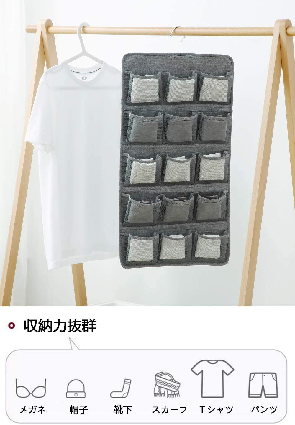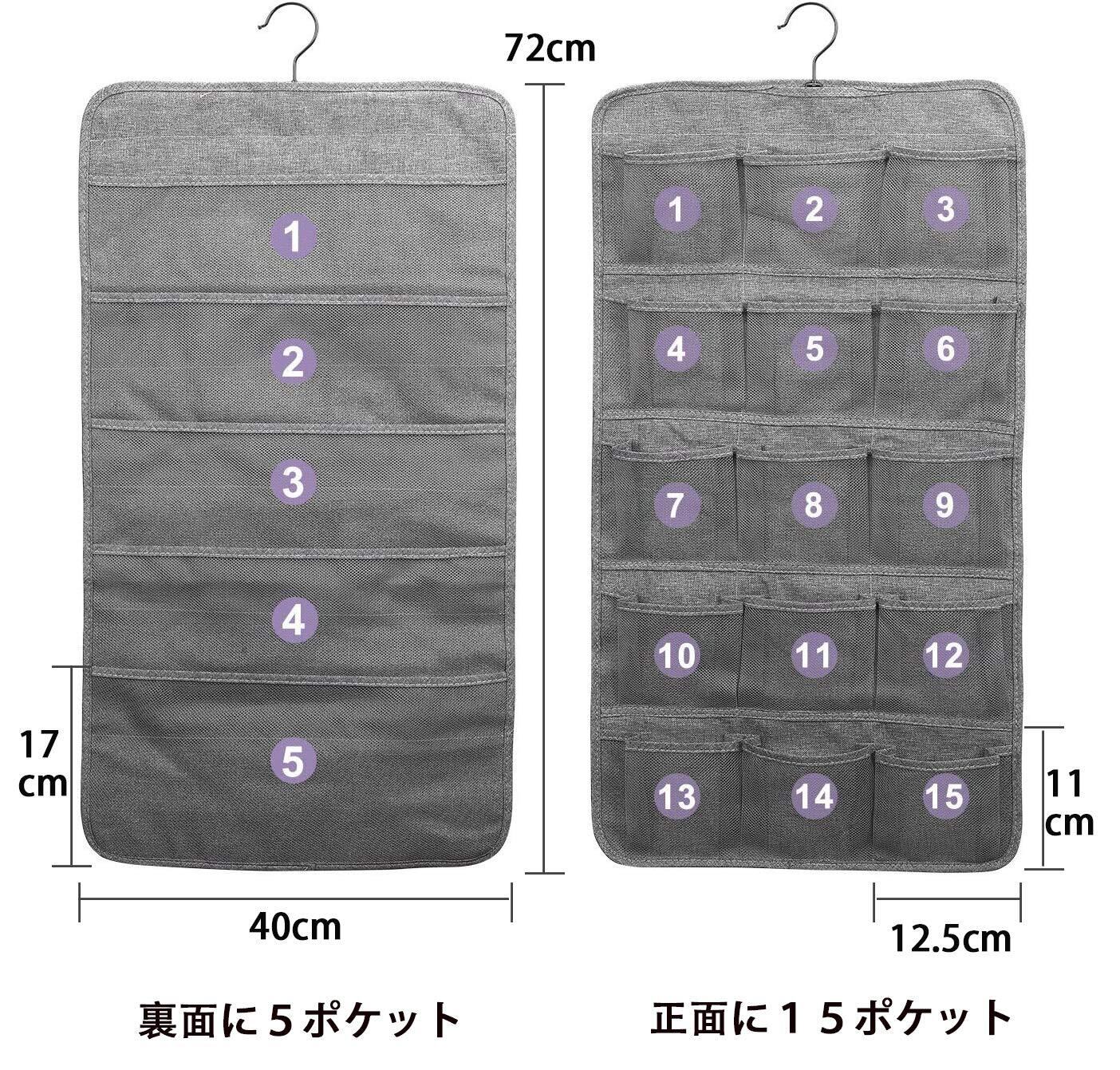 2.【大容量サイズ】80*40センチの両面サイド収納ポケットは正面が15個のポケットがあり、反面が5個があり、合計20個のポケットが利用可能!ランジェリーをいっぱいもっているおうちなら、クローゼットに吊り下げる収納も便利です。引き出しに入り切らなくても外に大容量の収納を確保できますよ。